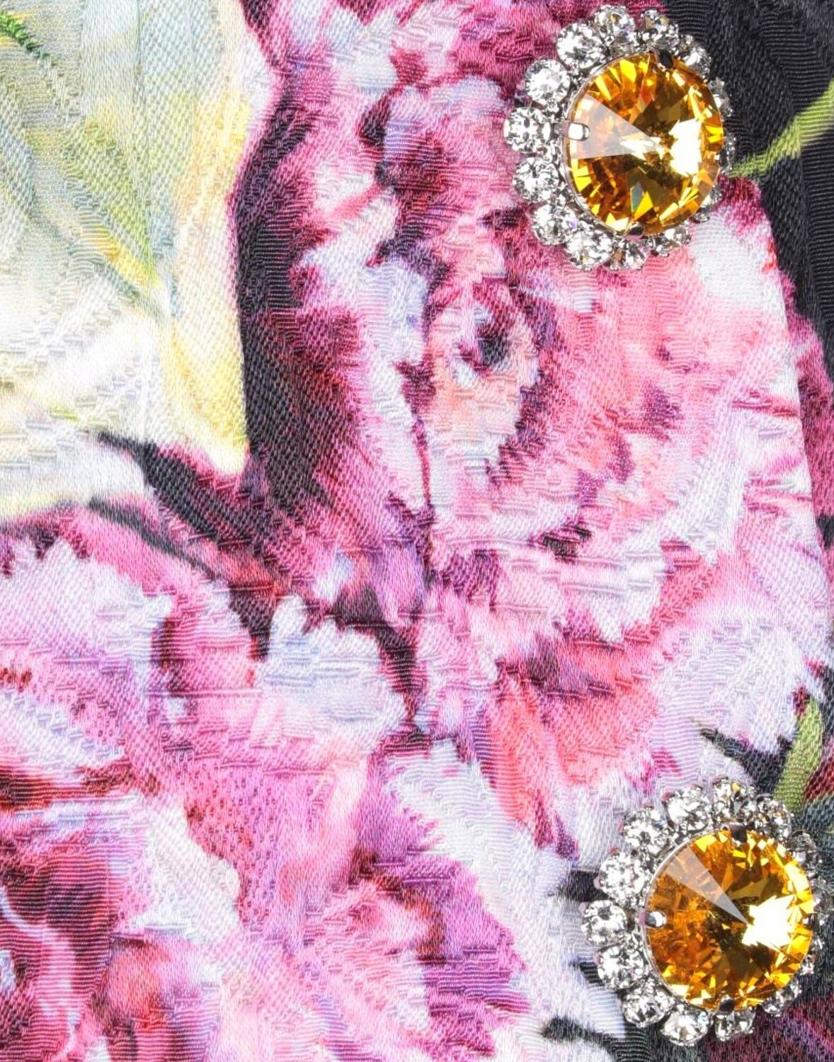Расклешенная юбка, жаккард, ткань, цветочный принт, стразы, застежка-молния, без карманов