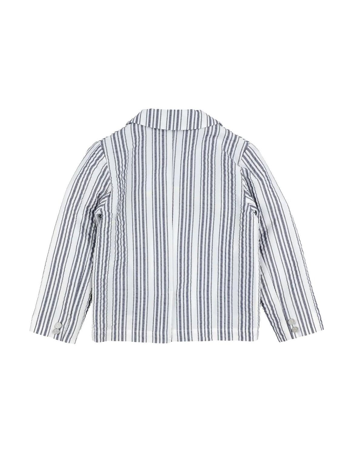 Полотняное переплетение, без аппликаций, в полоску, однобортное, воротник с лацканами, длинные рукава, внутренняя часть на частичной подкладке, 2 пуговицы, разрез сзади, множество карманов, стирать при 30°С, не отбеливать, нельзя сушить в стиральной машине, гладить при 110°С Макс, химчистка