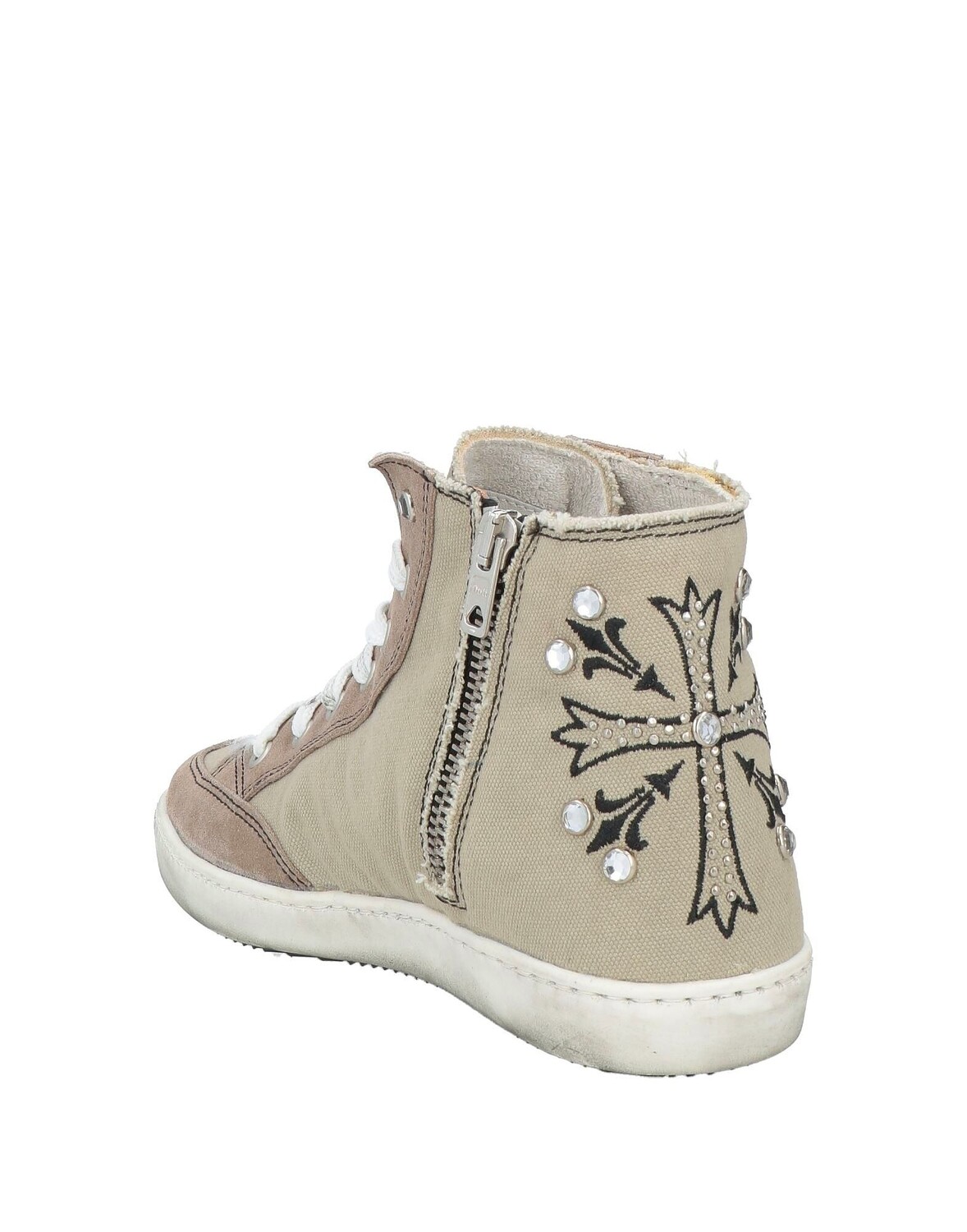 Высокие кеды, парусина, замша, вышивка, заклепки, одноцветное изделие с аппликациями, внутри тканевая, шнуровка, застежка-молния, круглый носок, плоская подошва, резиновая подошва, содержит нетекстильные части животного происхождения