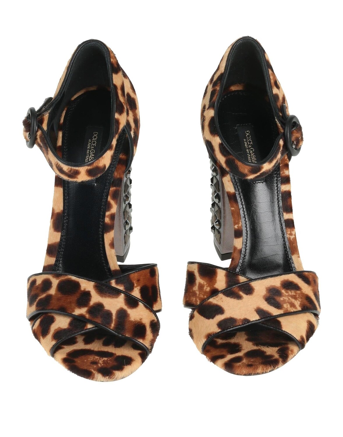 Телячий волос, кристаллы, заклепки, леопардовый принт, подкладка из кожи, ремешок на щиколотке с пряжкой, круглый носок, квадратный каблук, кожаная подошва, содержит нетекстильные части животного происхождения, босоножки с ремешком на щиколотке