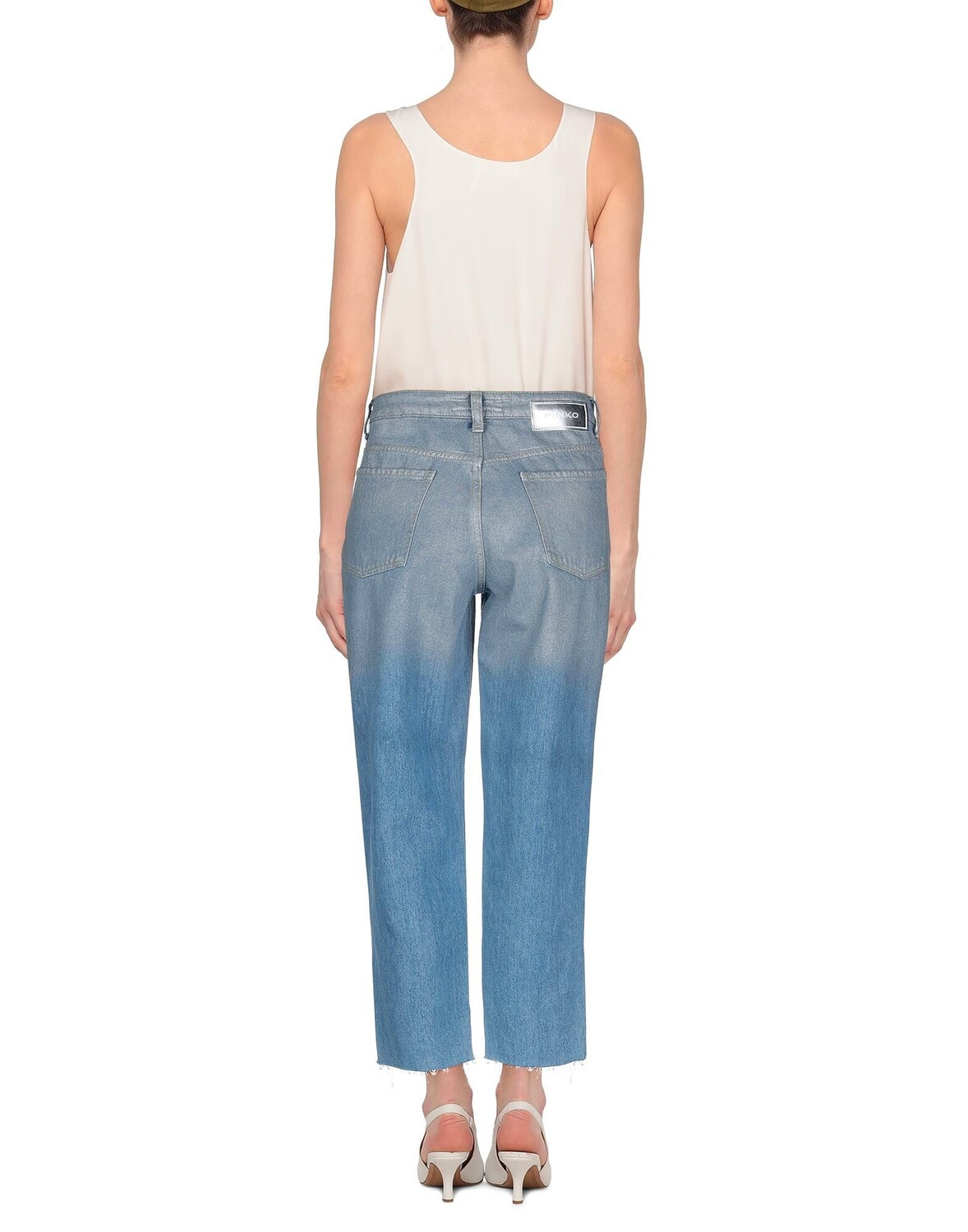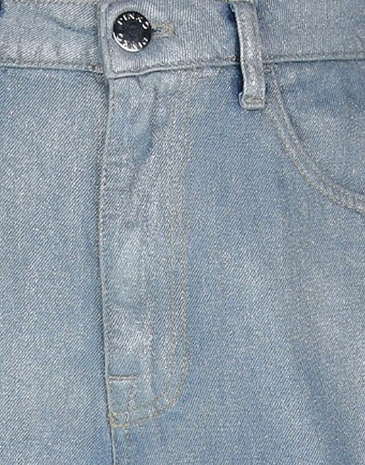 Джинсовая ткань, логотип, блестки, одноцветное изделие, светлая стирка, средняя посадка, застежка спереди, пуговицы, молния, множество карманов, необработанный подол