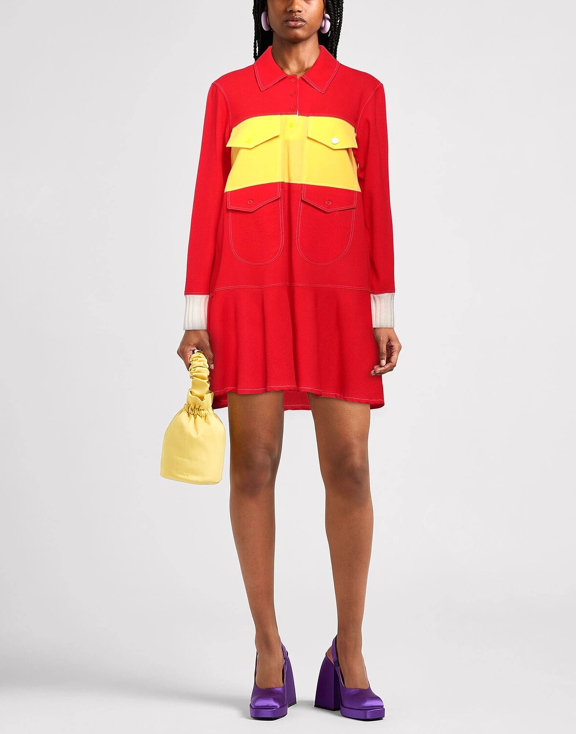 Платье-рубашка, креп, трикотажная отделка, двухцветное, воротник классический, длинные рукава, без подкладки, застежка на пуговицы, множество карманов, химчистка, нельзя отбеливать, нельзя сушить в стиральной машине