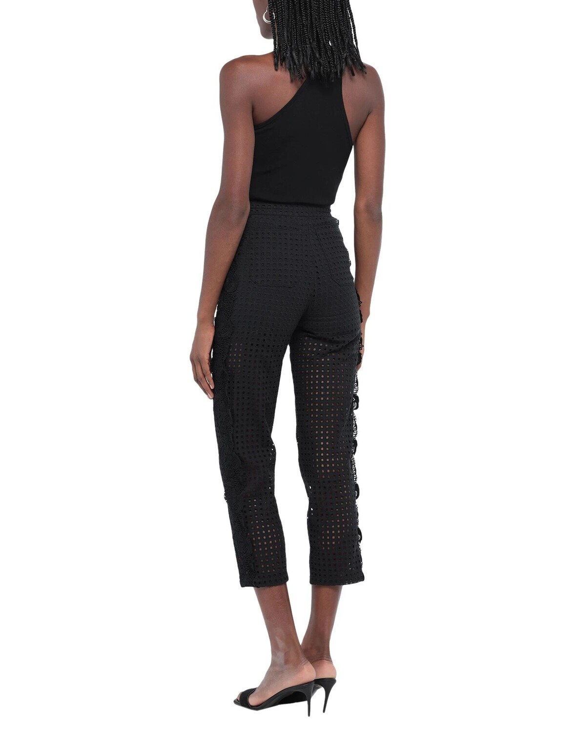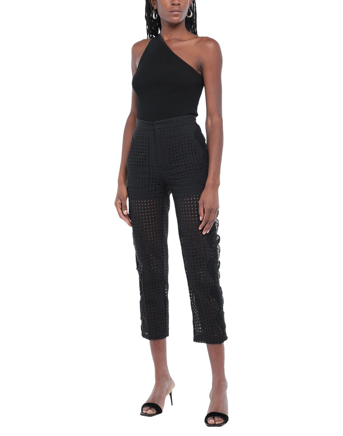 Полотняное переплетение, кружево, без аппликаций, одноцветное изделие, завышенная талия, зауженные брючины, стандартный крой, множество карманов