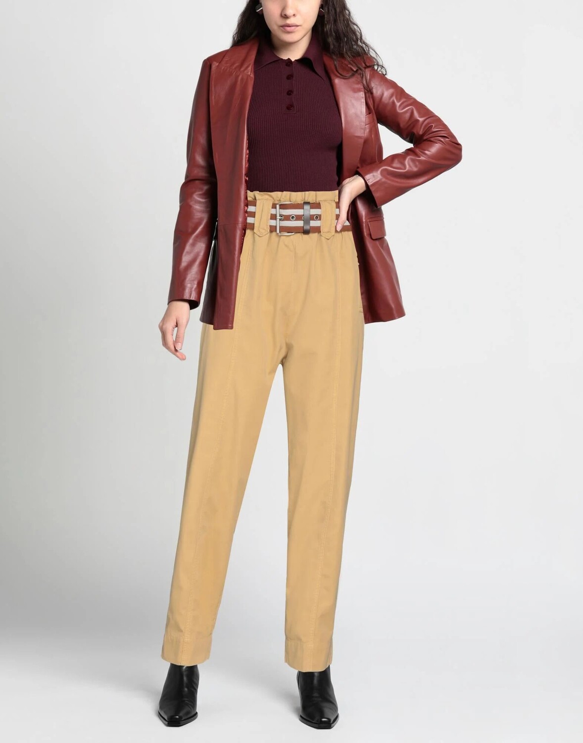 Брюки, ткань, пояс, одноцветное изделие, завышенная талия, пояс на талии, зауженные брючины, свободный крой, множество карманов