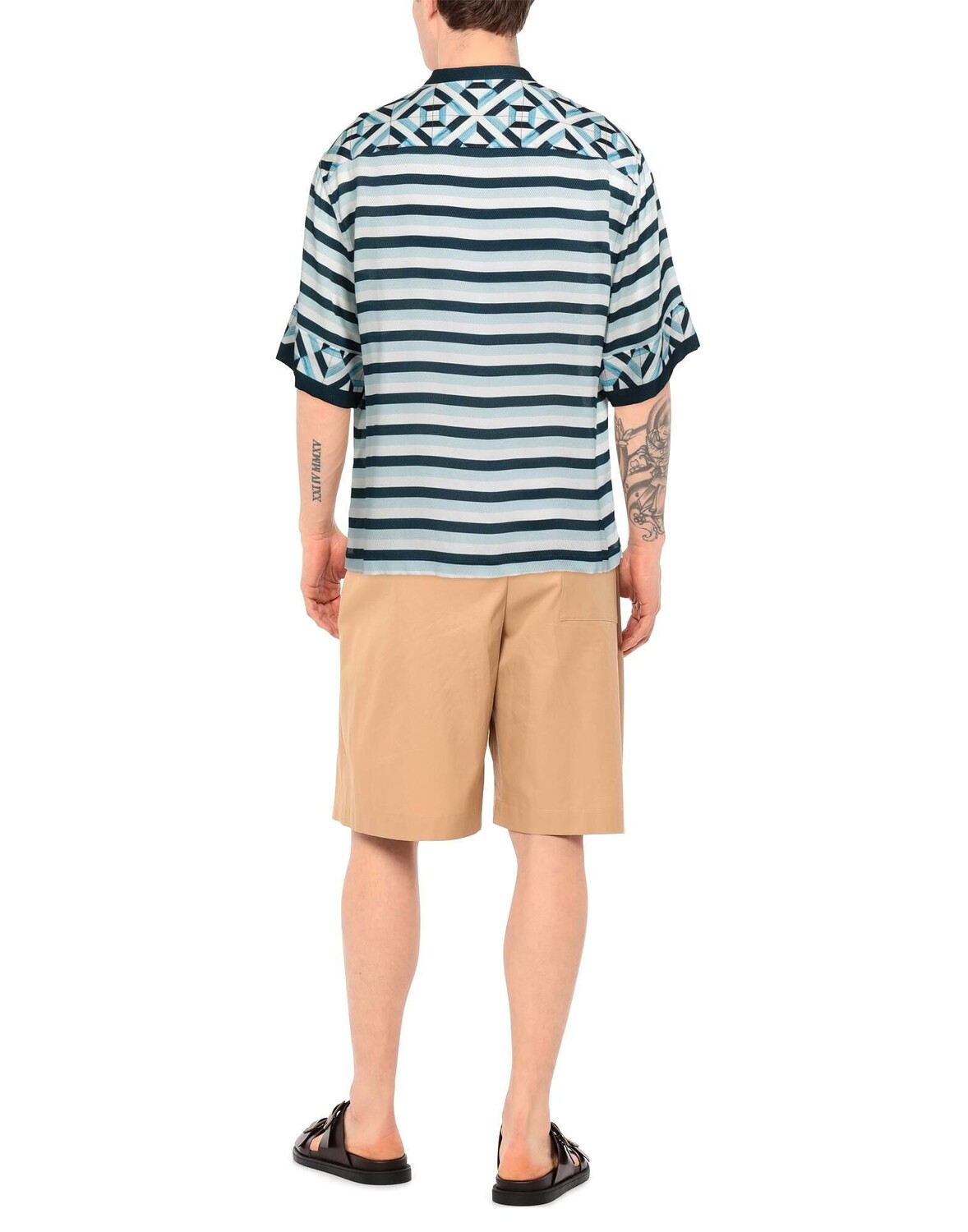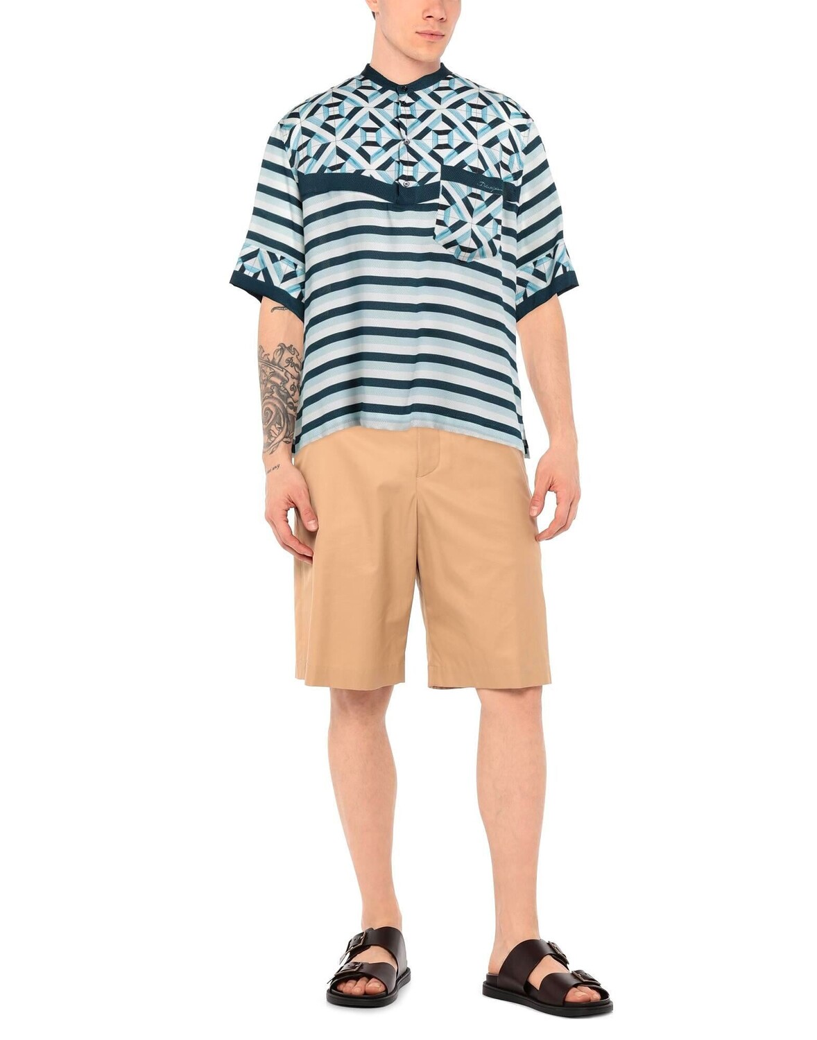 Жаккард, креп, логотип бренда, геометрический дизайн, полоски, воротник-стойка, короткие рукава, один нагрудный карман, большой размер