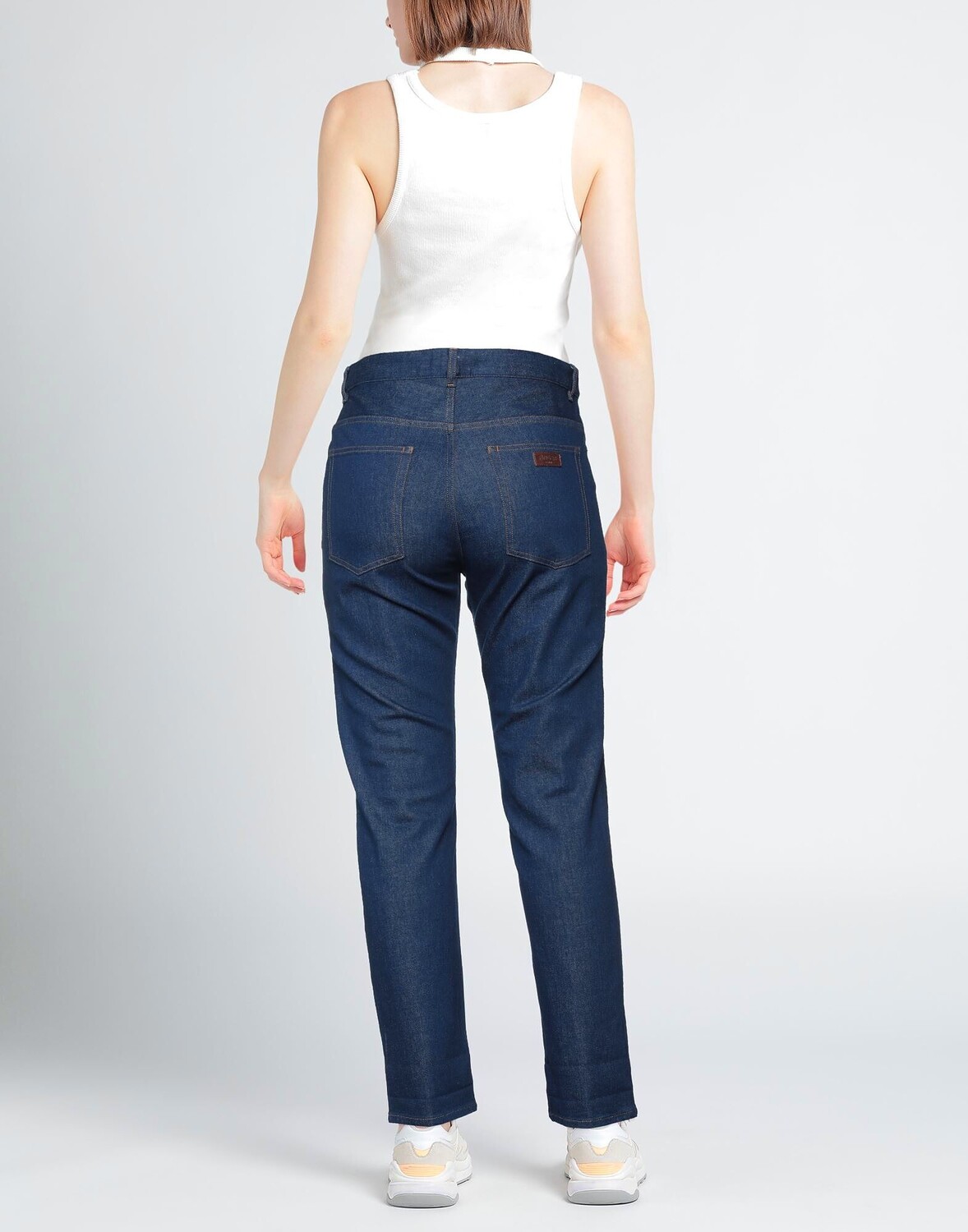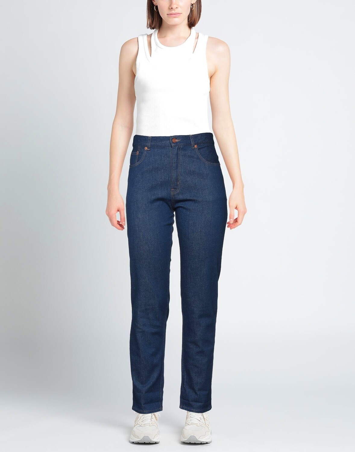 Джинсовая ткань, логотип бренда, одноцветное изделие, средняя степень стирки, завышенная талия, шлевки для ремня, зауженная брючина, стандартный крой, 1 пуговица, застежка-молния, множество карманов, стрейч, зауженная модель
