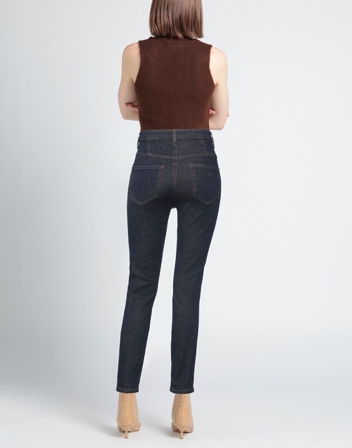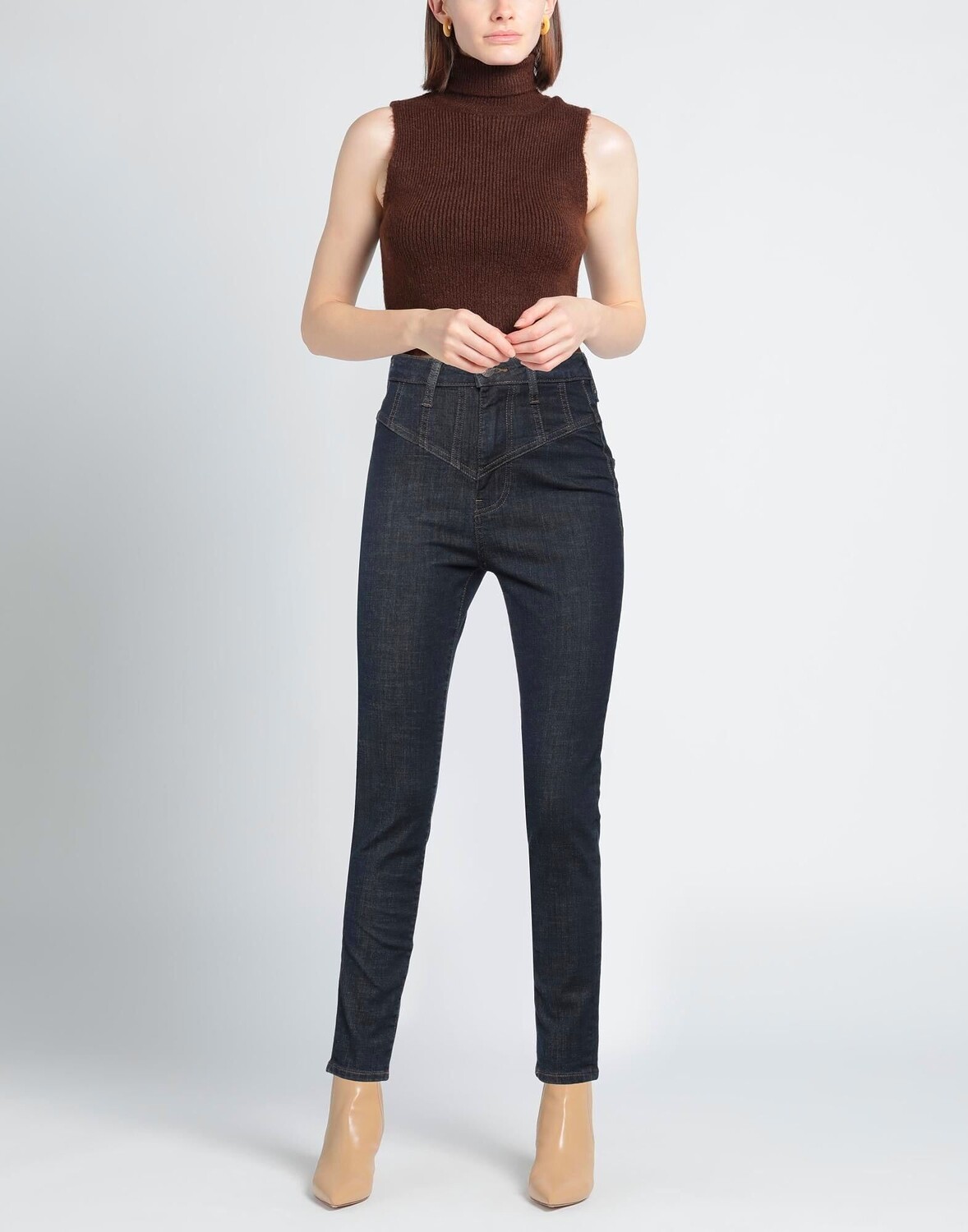 Джинсовая ткань, логотип бренда, одноцветное изделие, темный цвет, завышенная талия, шлевки для ремня, зауженные брючины, узкие брюки, 1 пуговица, застежка-молния, множество карманов, стрейч, модель скинни