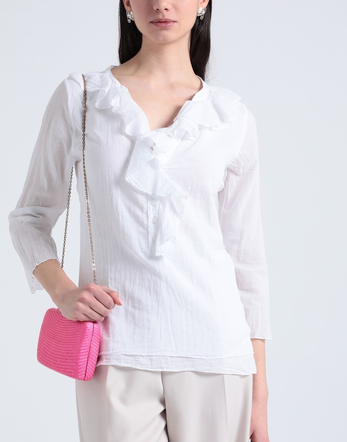 Полотняное переплетение, мятый эффект, оборки, одноцветное изделие, v-образный вырез, рукава 3/4, внутренняя часть на частичной подкладке, пуговицы, без карманов
