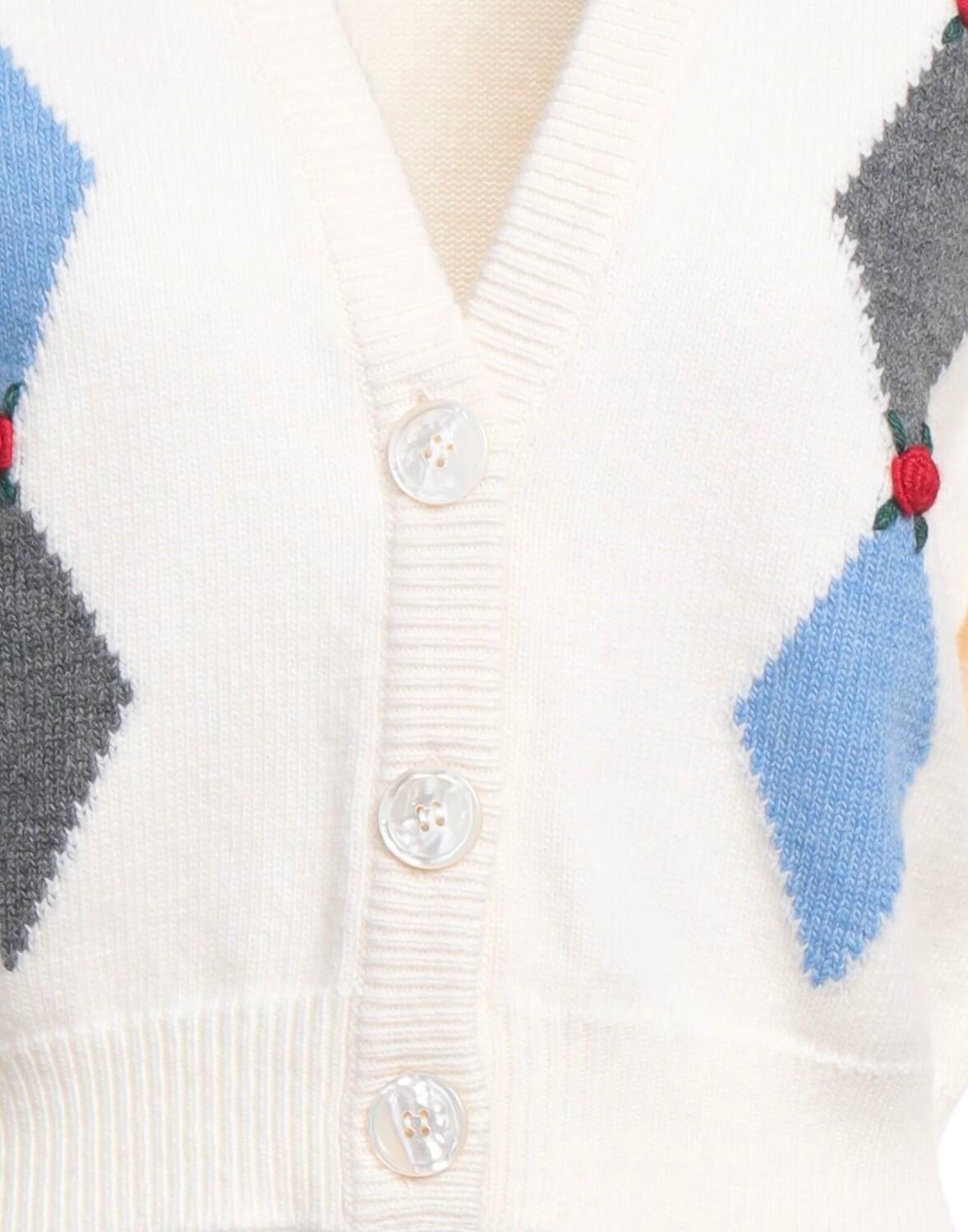 Шерсть, легкий трикотаж, цветочные аппликации, геометрический принт, длинные рукава, застежка на пуговицы, без карманов, химчистка, нельзя сушить в стиральной машине, не отбеливать
