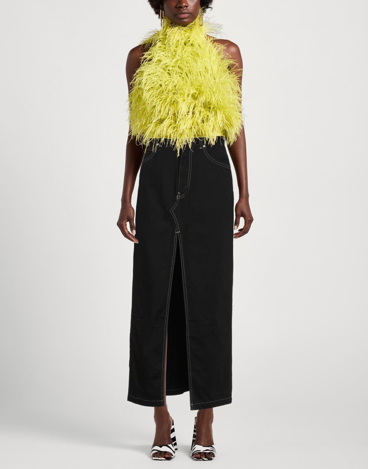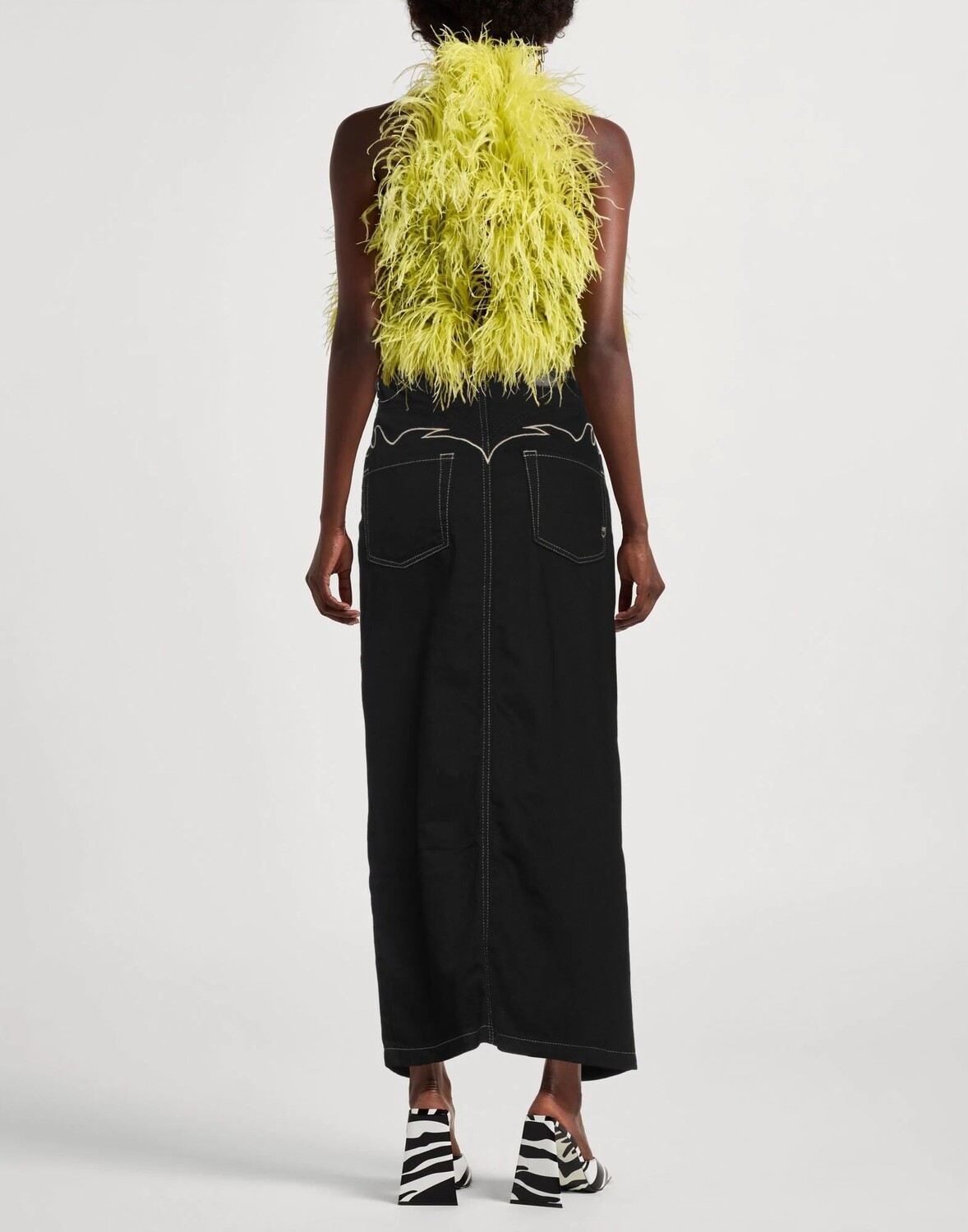 Расклешенная юбка, джинсовая ткань, вышивка, логотип бренда, одноцветное изделие с аппликациями, цветная стирка, шлевки для ремня, без подкладки, 1 пуговица, застежка-молния, разрез спереди, множество карманов, машинная стирка, нельзя отбеливать, нельзя сушить в стиральной машине
