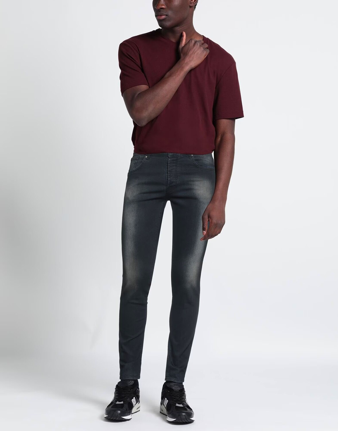 Деним, потертости, логотип бренда, полосы по боковым швам, одноцветное изделие, темный цвет, средняя посадка, шлевки для ремня, зауженные брючины, узкие брюки, пуговицы, пять карманов, модель прямого кроя