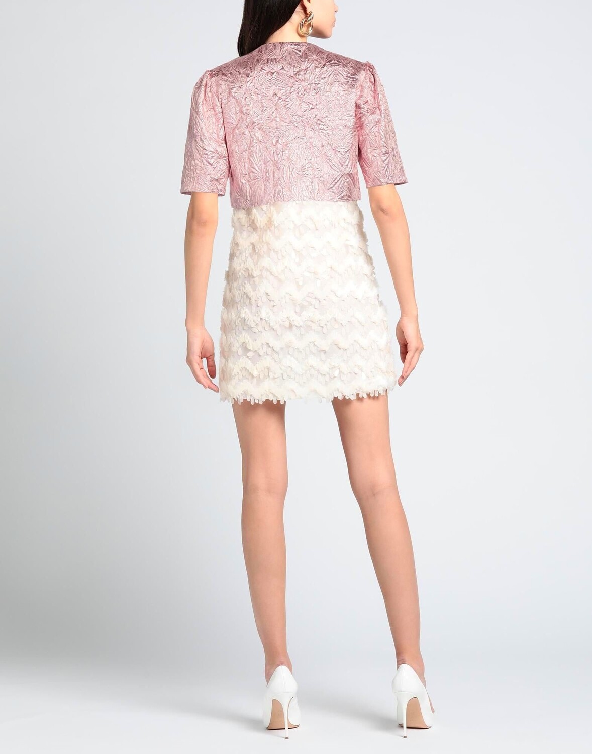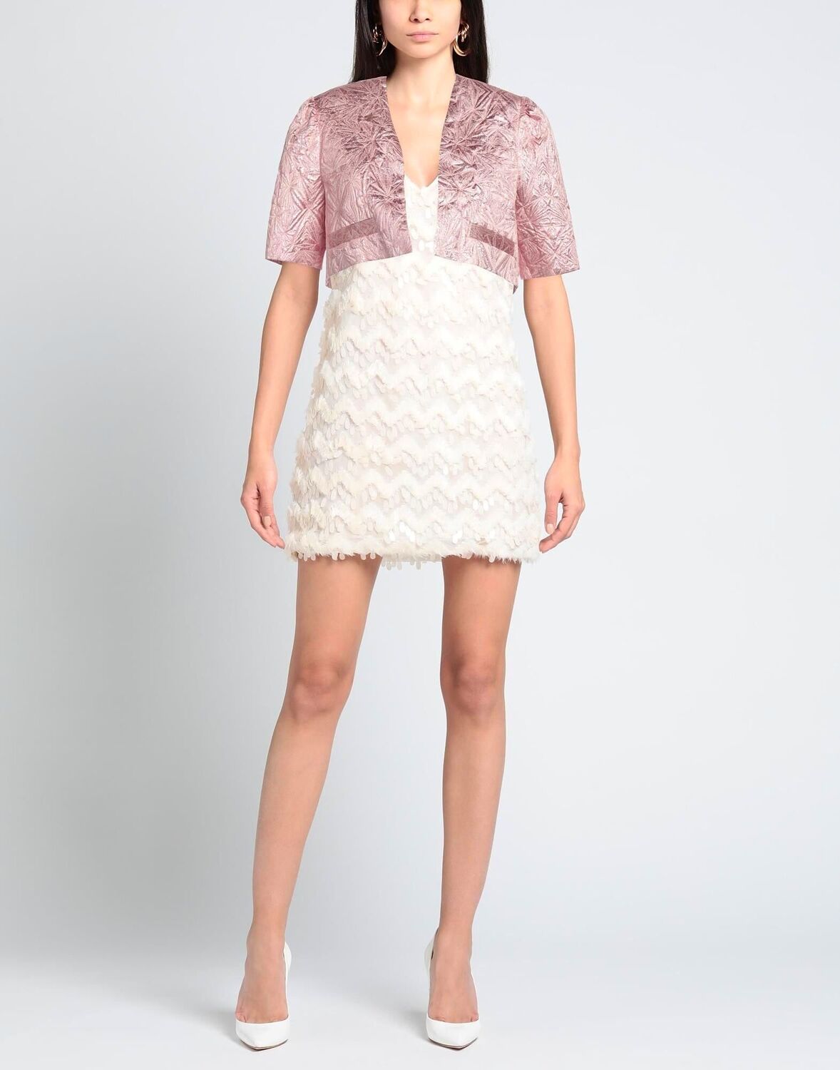 Жакет-болеро, тканый, жаккардовый, однотонный, без аппликаций, глубокий вырез, однобортный, короткие рукава, на подкладке, без карманов, химчистка, не отбеливать, не сушить в стиральной машине.