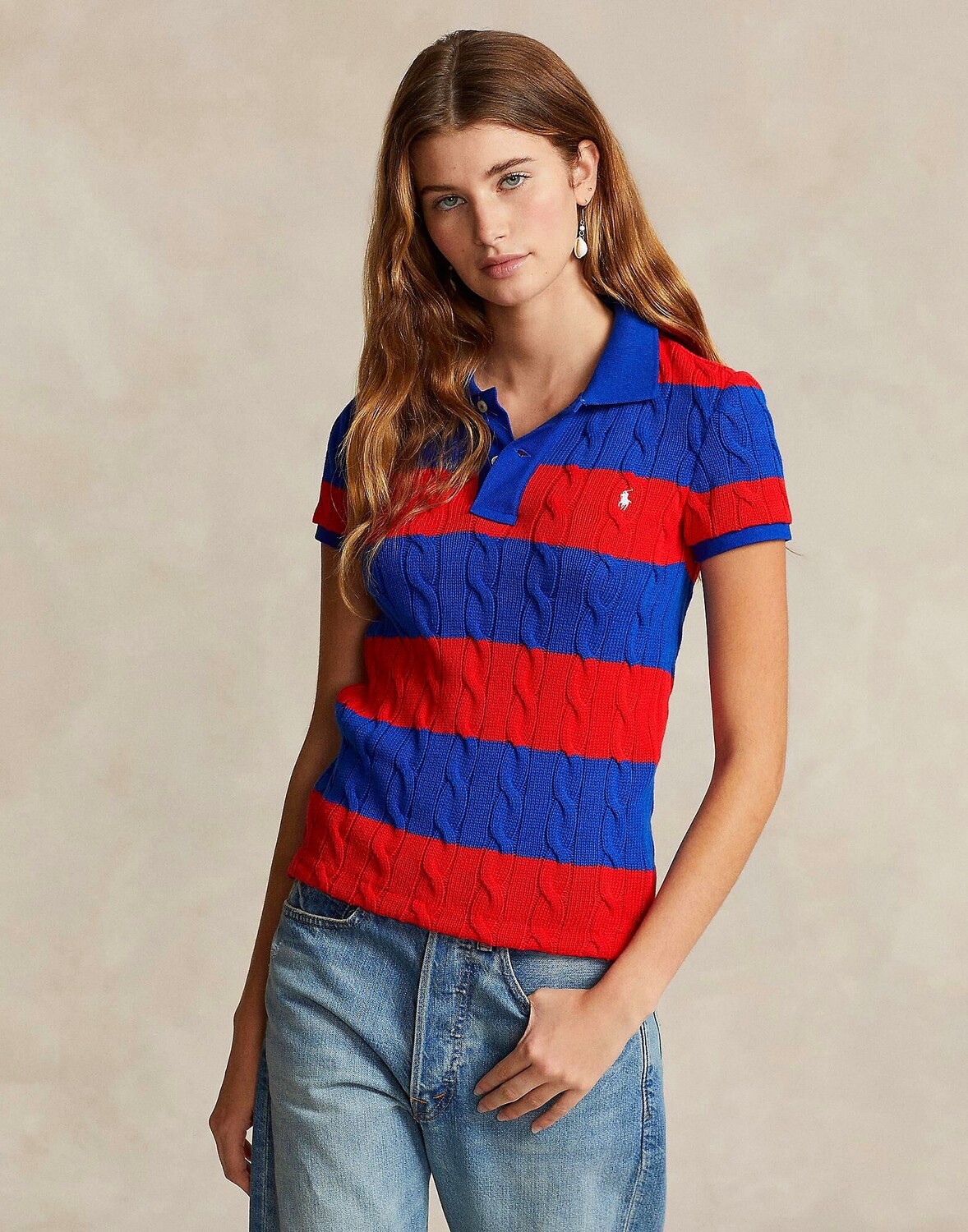 Косичка, легкий трикотаж, логотип бренда, в полоску, двухцветный, воротник-поло, короткие рукава, 2 пуговицы, боковой разрез по низу