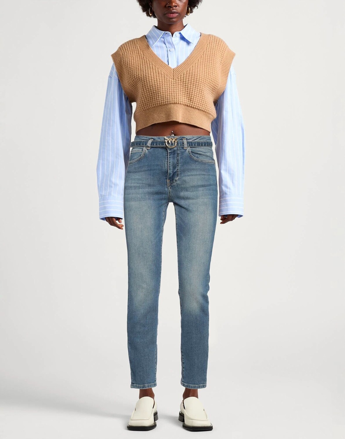 Деним, потертый, ремень, кожаная отделка, логотип бренда, одноцветное изделие, средняя стирка, высокая талия, приталенный крой, застежка-молния, 1 пуговица, множество карманов, стрейч, химчистка, нельзя отбеливать, нельзя сушить в стиральной машине, содержит нетекстильные материалы части животного происхождения, джинсы скинни