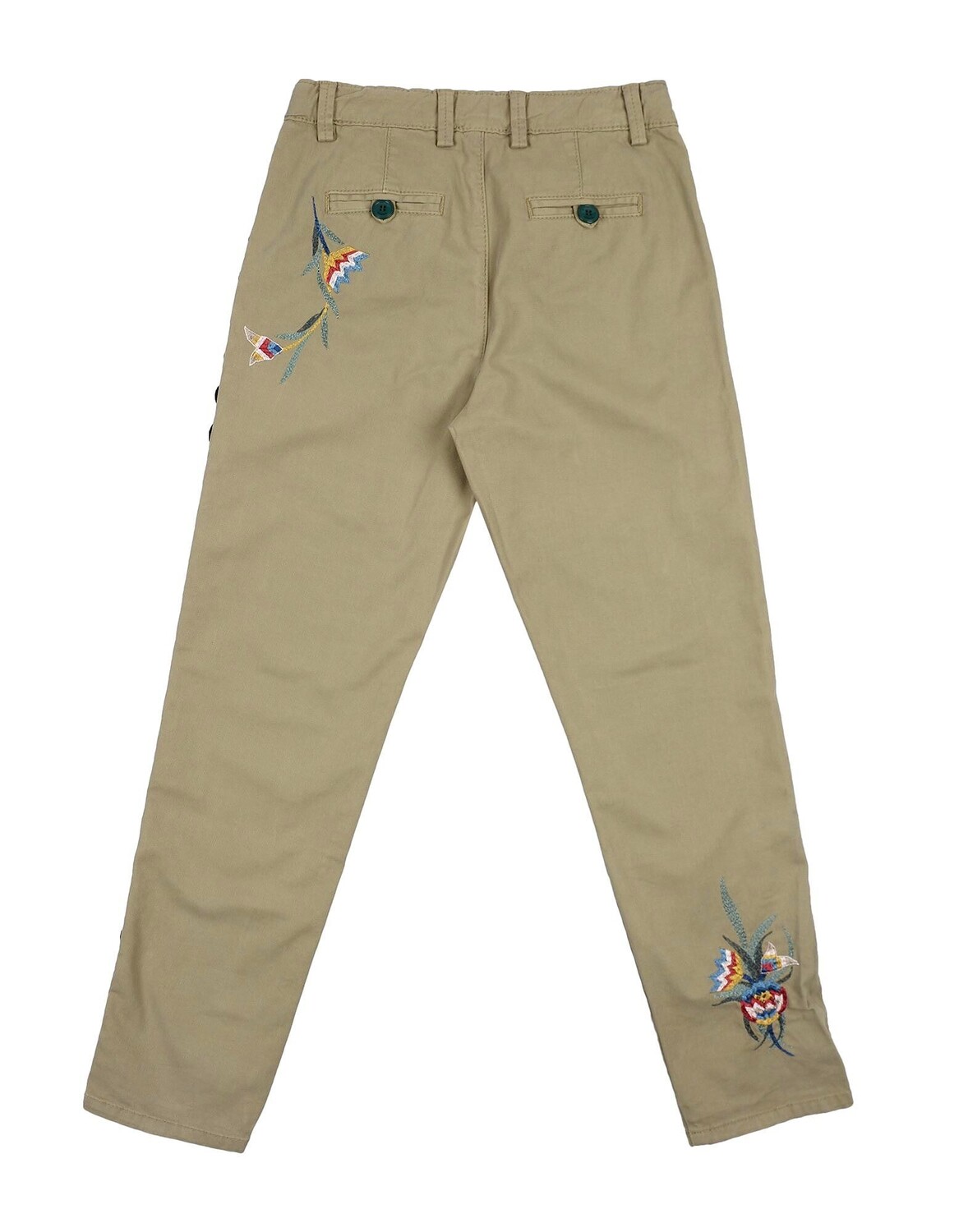 Габардин, полосы по боковым швам, вышивка, одноцветное изделие, пуговицы, молния, множество карманов, стирка при 30°C, не подвергать химчистке, гладить при температуре не выше 110°C, не отбеливать, можно сушить в стиральной машине, эластичный, брюки