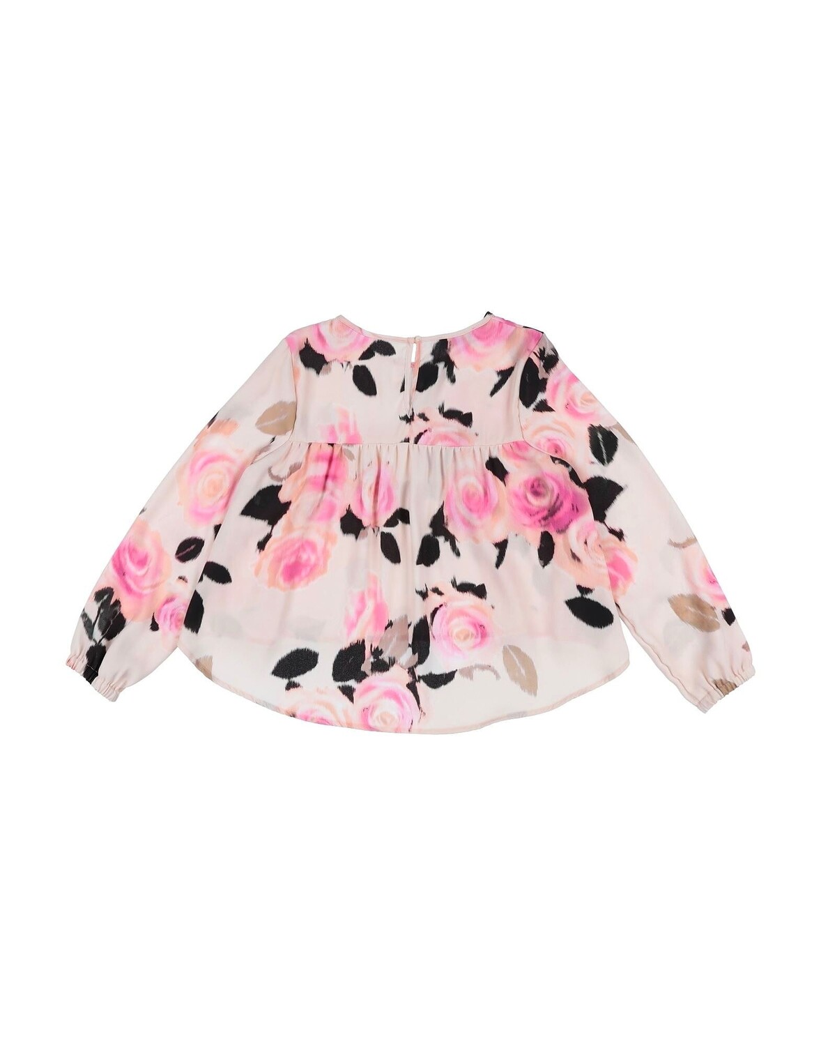 Креп, без аппликаций, цветочный дизайн, разноцветный узор, круглый вырез горловины, длинные рукава, пуговицы, без карманов, стирка при 30°C, химическая чистка, нельзя отбеливать, нельзя сушить в стиральной машине, гладить при температуре не выше 110°C