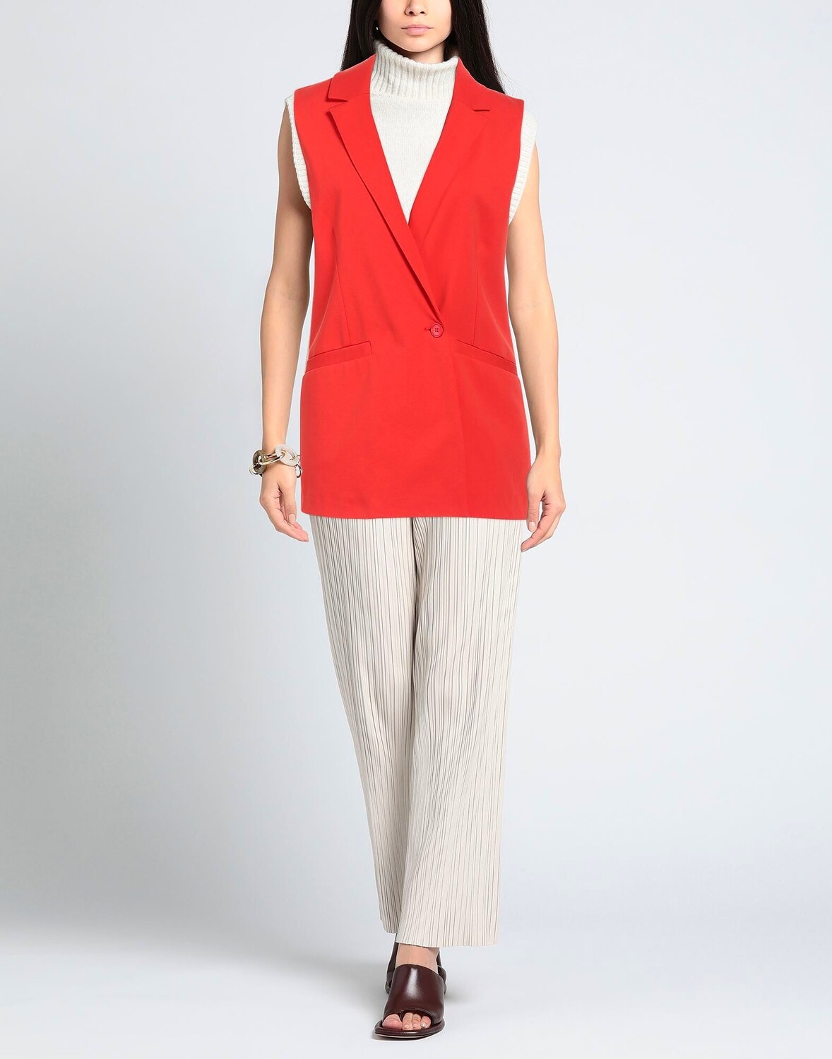 Трикотаж, без аппликаций, одноцветное изделие, воротник с лацканами, однобортный, без рукавов, на подкладке, 1 пуговица, множество карманов, разрез сзади, стрейч, однобортный пиджак