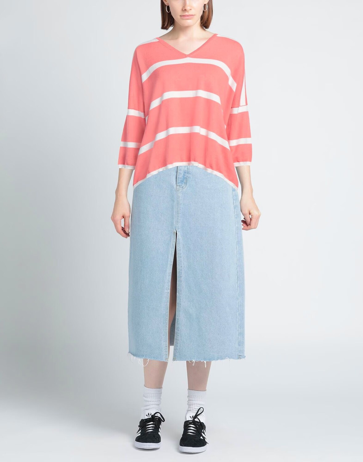 Трикотаж, легкая вязка, в полоску, без аппликаций, V-образный вырез, рукава 3/4, ручная стирка или химчистка, не отбеливать, нельзя сушить в стиральной машине
