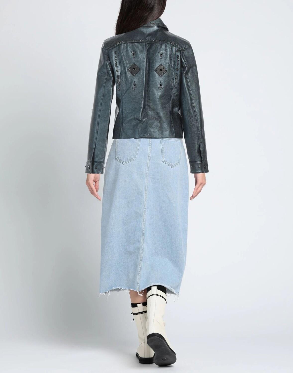 Кожа, металлик, декорирование, однотонное изделие с аппликациями, воротник классический, однобортный, длинные рукава, манжеты на кнопках, внутри на подкладке, застежка-молния, множество карманов, содержит нетекстильные части животного происхождения, не стирать, не отбеливать , не сушить в стиральной машине, повседневная куртка