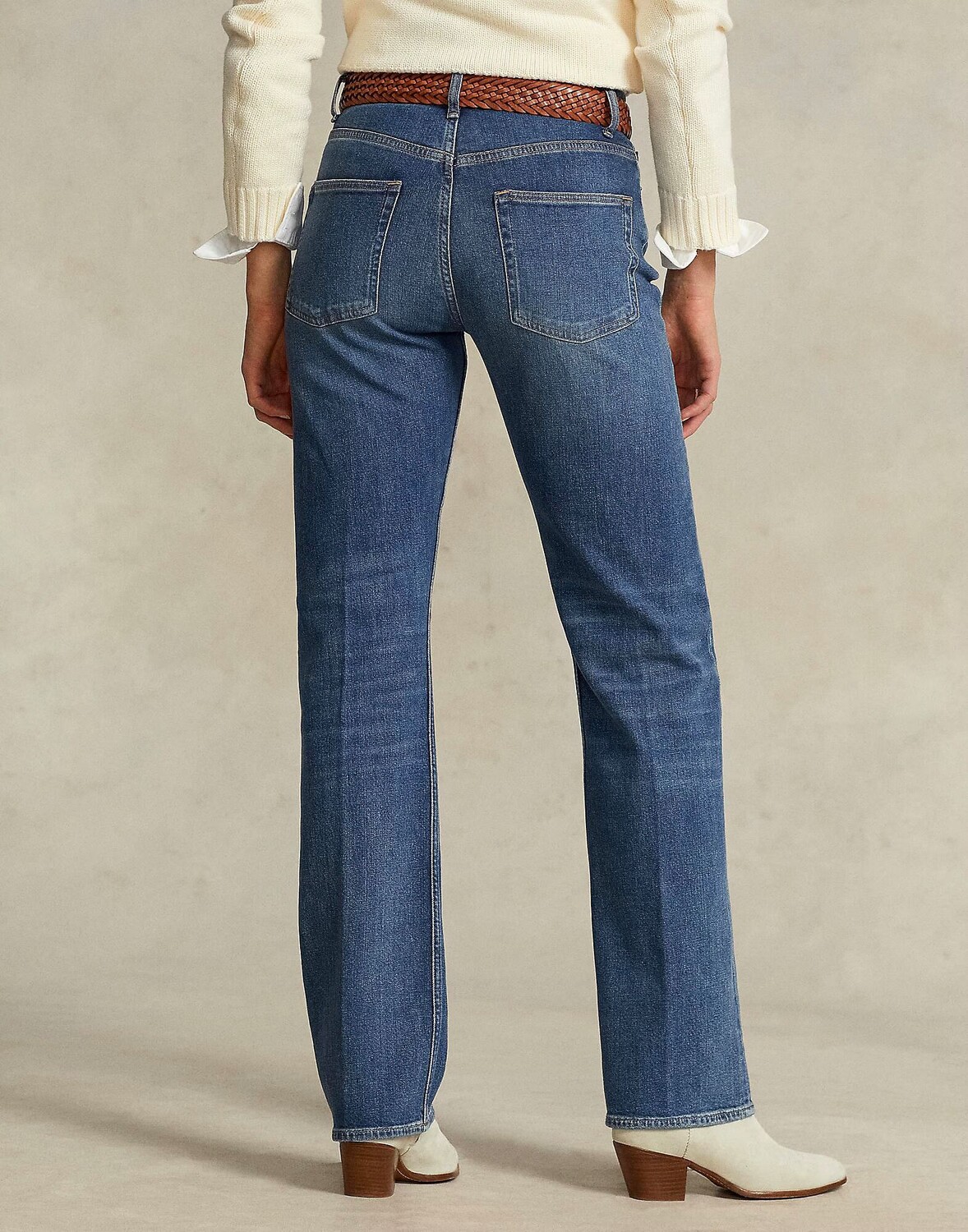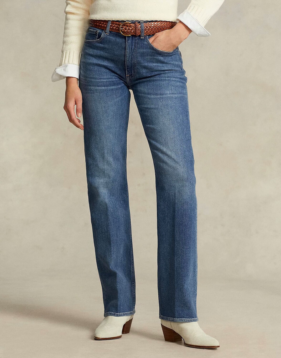 Деним, выцветший, логотип бренда, одноцветное изделие, средняя стирка, завышенная талия, застежка-молния, 1 пуговица, множество карманов, стрейч, содержит нетекстильные части животного происхождения, модель прямого кроя