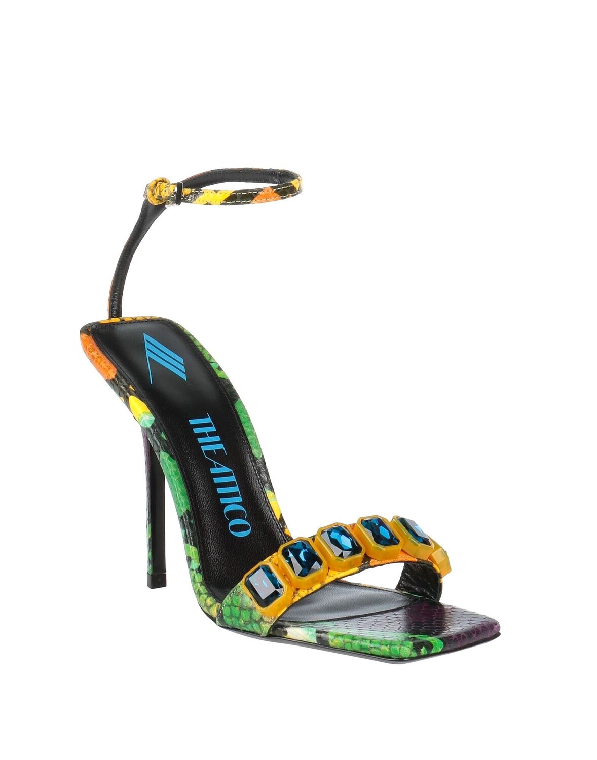 Кожа, змеиный принт, стразы, животный принт, разноцветный узор, кожаная подкладка, ремешок с пряжкой, квадратный носок, каблук-шпилька, кожаная подошва, содержит нетекстильные части животного происхождения, сандалии с ремешком на щиколотке