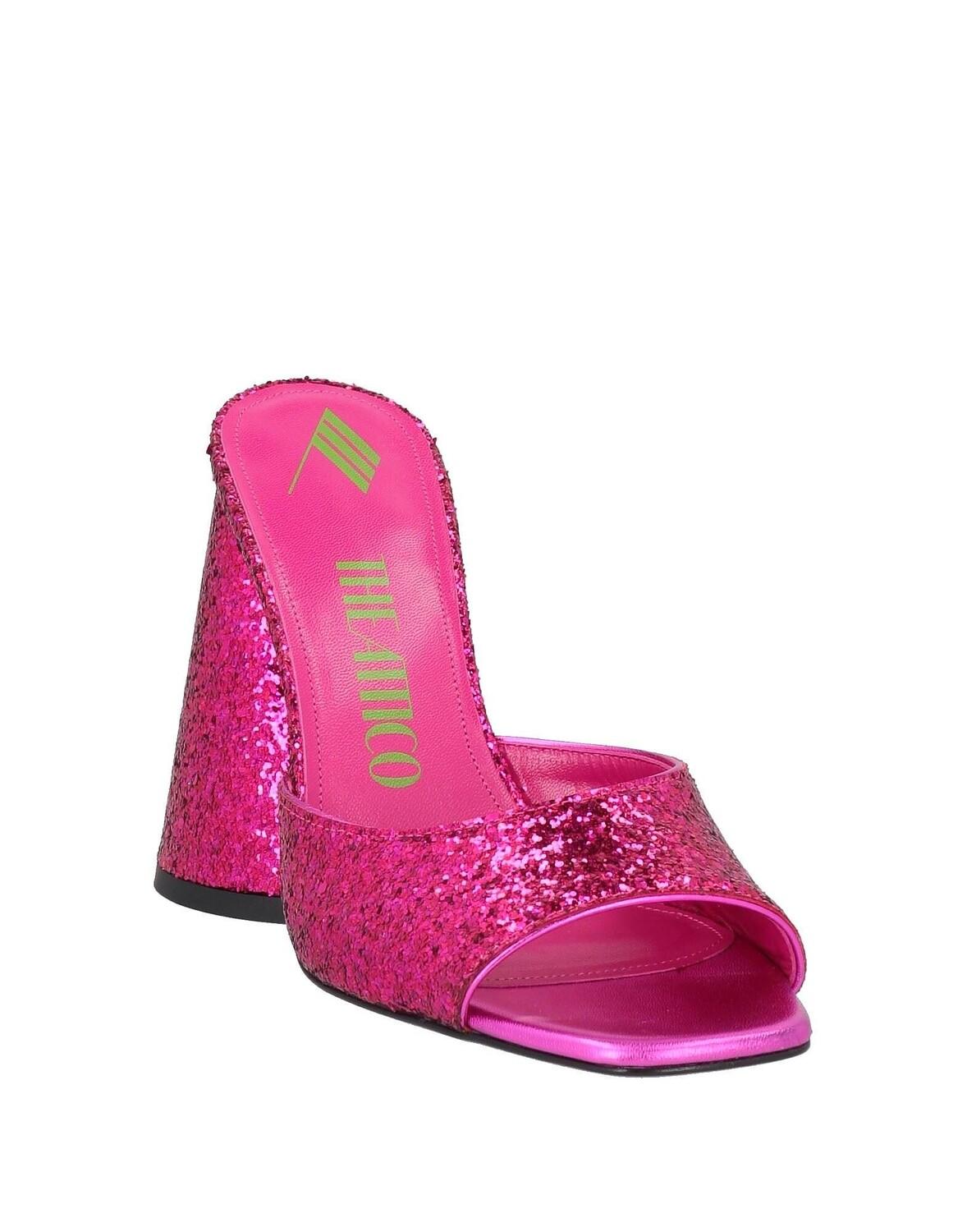 Полотняное переплетение, блестки, одноцветное изделие, кожаная подкладка, квадратный носок, конический каблук, кожаная подошва, содержит нетекстильные части животного происхождения, шлепанцы
