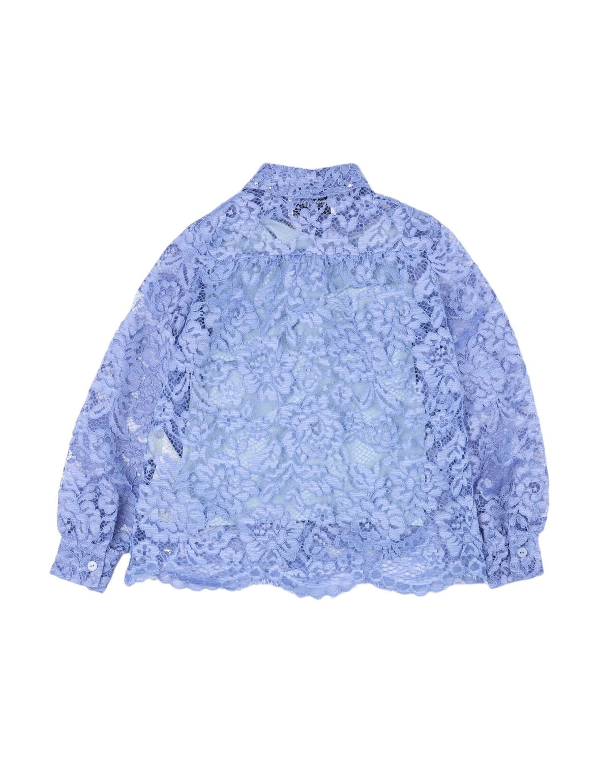 Кружево, стразы, логотип бренда, одноцветное изделие с аппликациями, классический вырез горловины, длинные рукава, манжеты на пуговицах, застежка на пуговицы, без карманов, ручная стирка, не подвергать химчистке, не отбеливать, нельзя сушить в стиральной машине, гладить при 110°С макс.