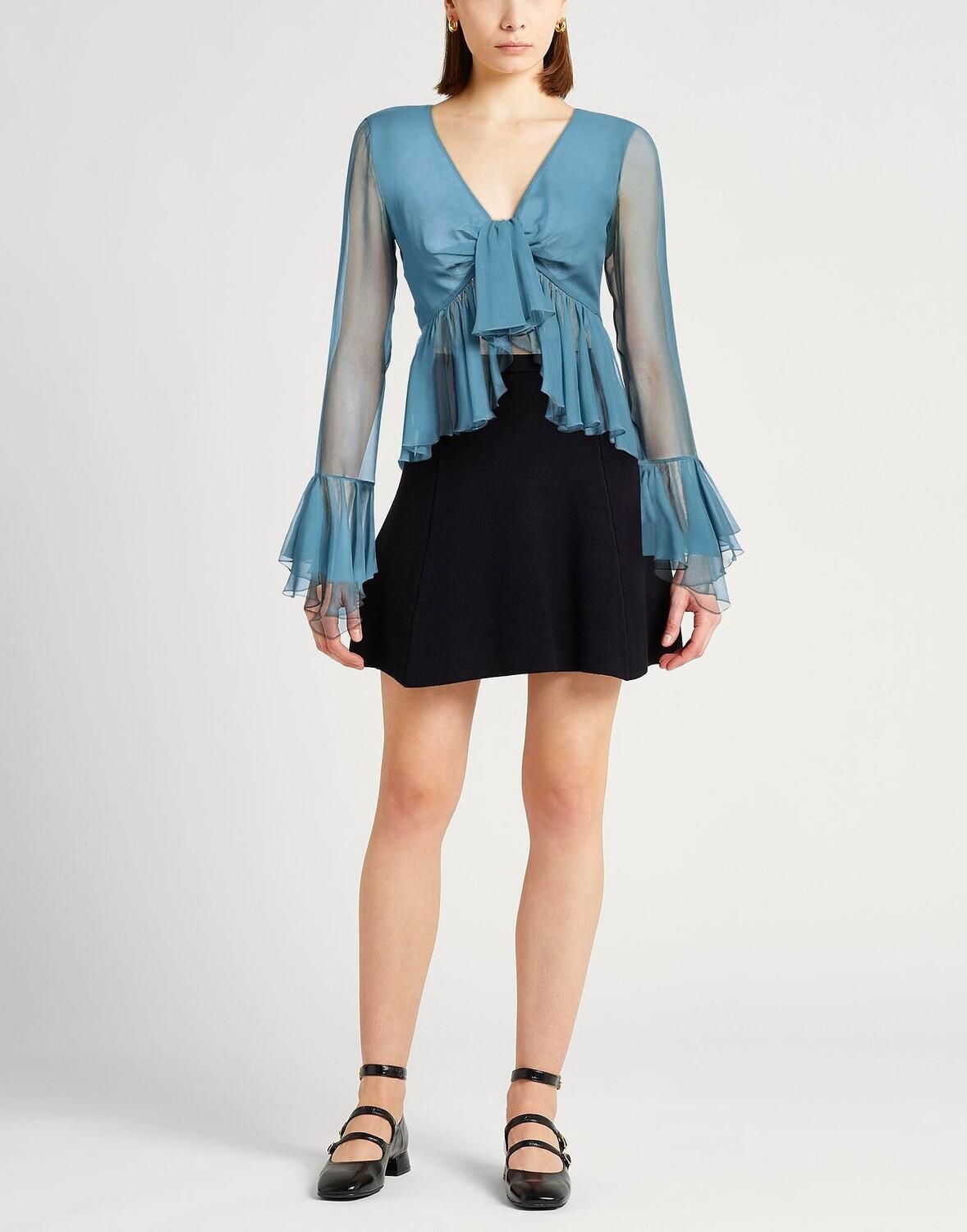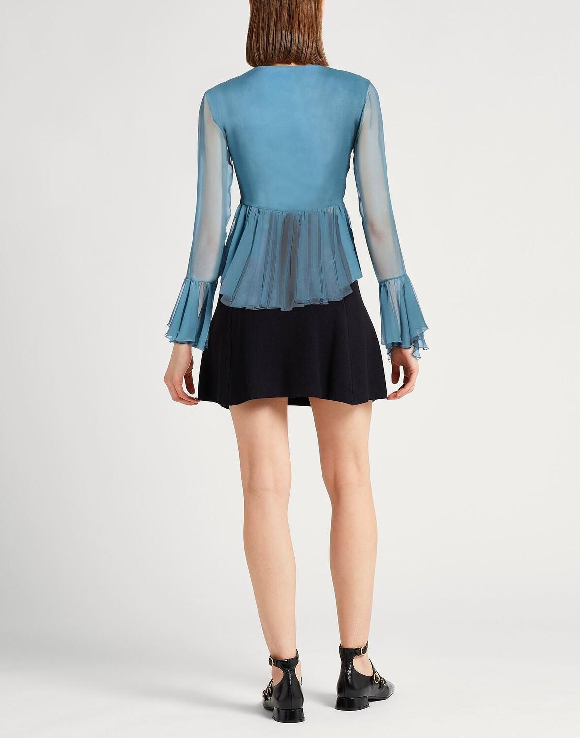 Креп, без аппликаций, одноцветное изделие, v-образный вырез, длинные рукава, без карманов, химчистка, нельзя отбеливать, нельзя сушить в стиральной машине, верх со сборками, небольшой тираж этой марки