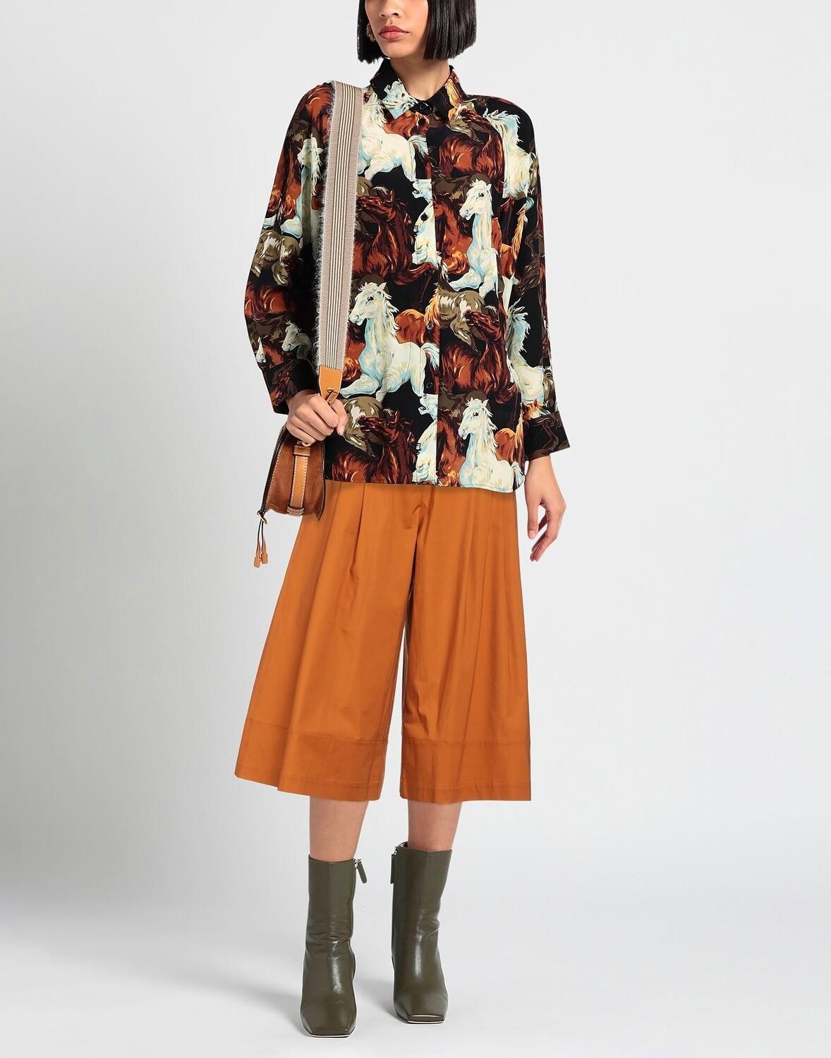 Полотняное переплетение, вытачки, одноцветное изделие, завышенная талия, широкие брючины, стандартный крой, застежка-молния, 1 пуговица, множество карманов, эластичная, разделенная юбка