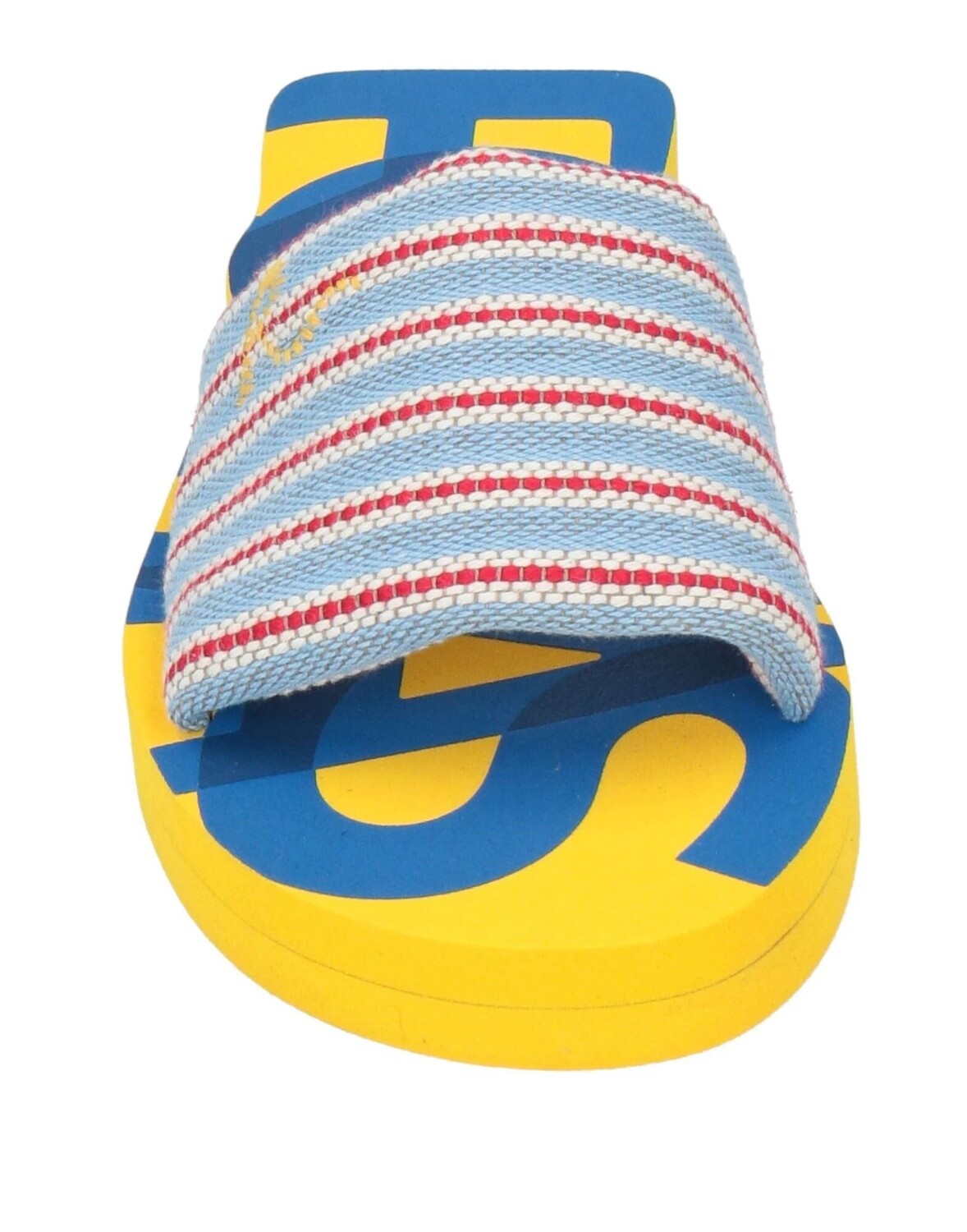 Полотняное переплетение, логотип бренда, полоски, подкладка из кожи, скругленный носок, без каблука, резиновая подошва, содержит нетекстильные части животного происхождения, шлепанцы