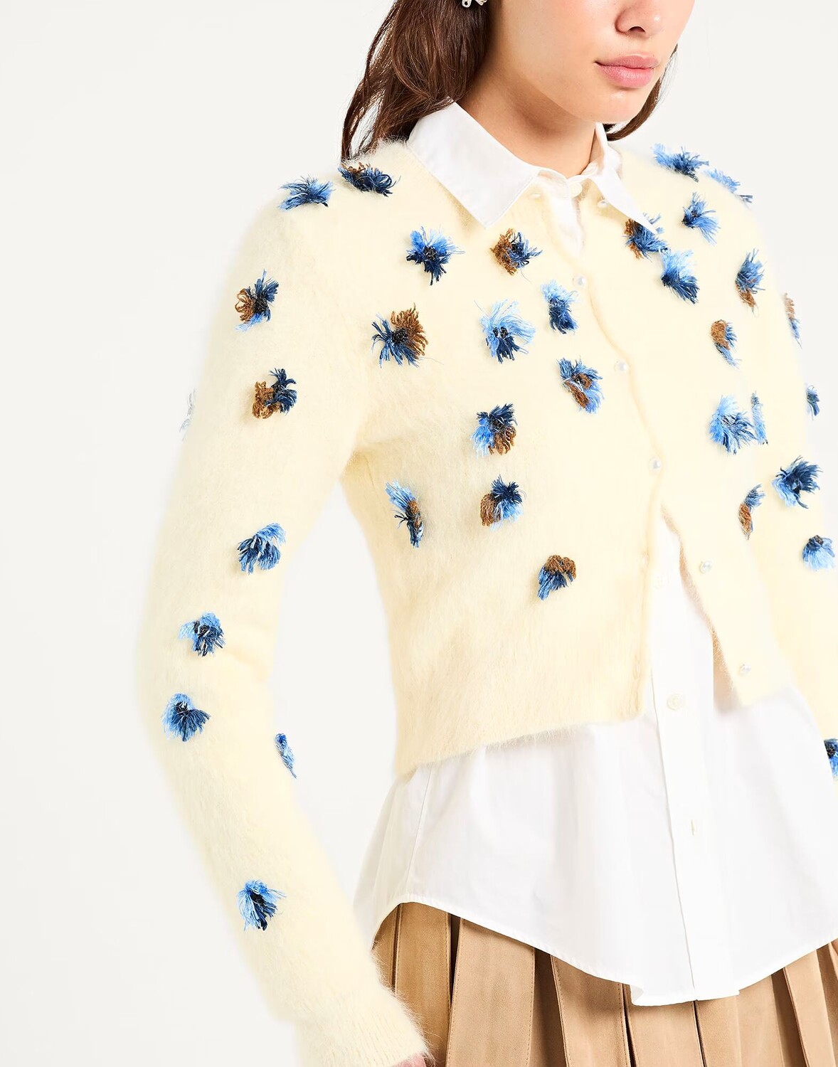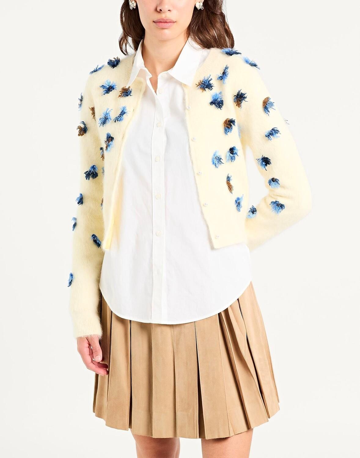 Шерсть, трикотаж средней плотности, цветочные аппликации, одноцветное изделие с аппликациями, длинные рукава, застежка на пуговицах, без карманов, машинная стирка или химчистка, не отбеливать, не подвергать машинной сушке