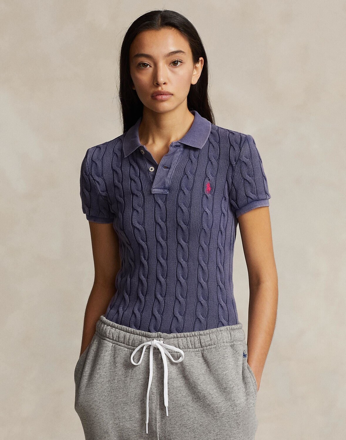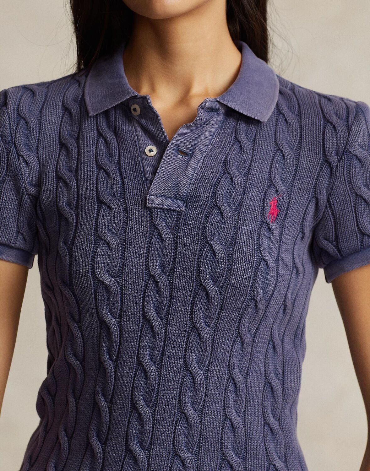 Косая вязка, легкий трикотаж, логотип бренда, одноцветное изделие, воротник-поло, короткие рукава, застежка на пуговицы, без карманов, нижний разрез по бокам