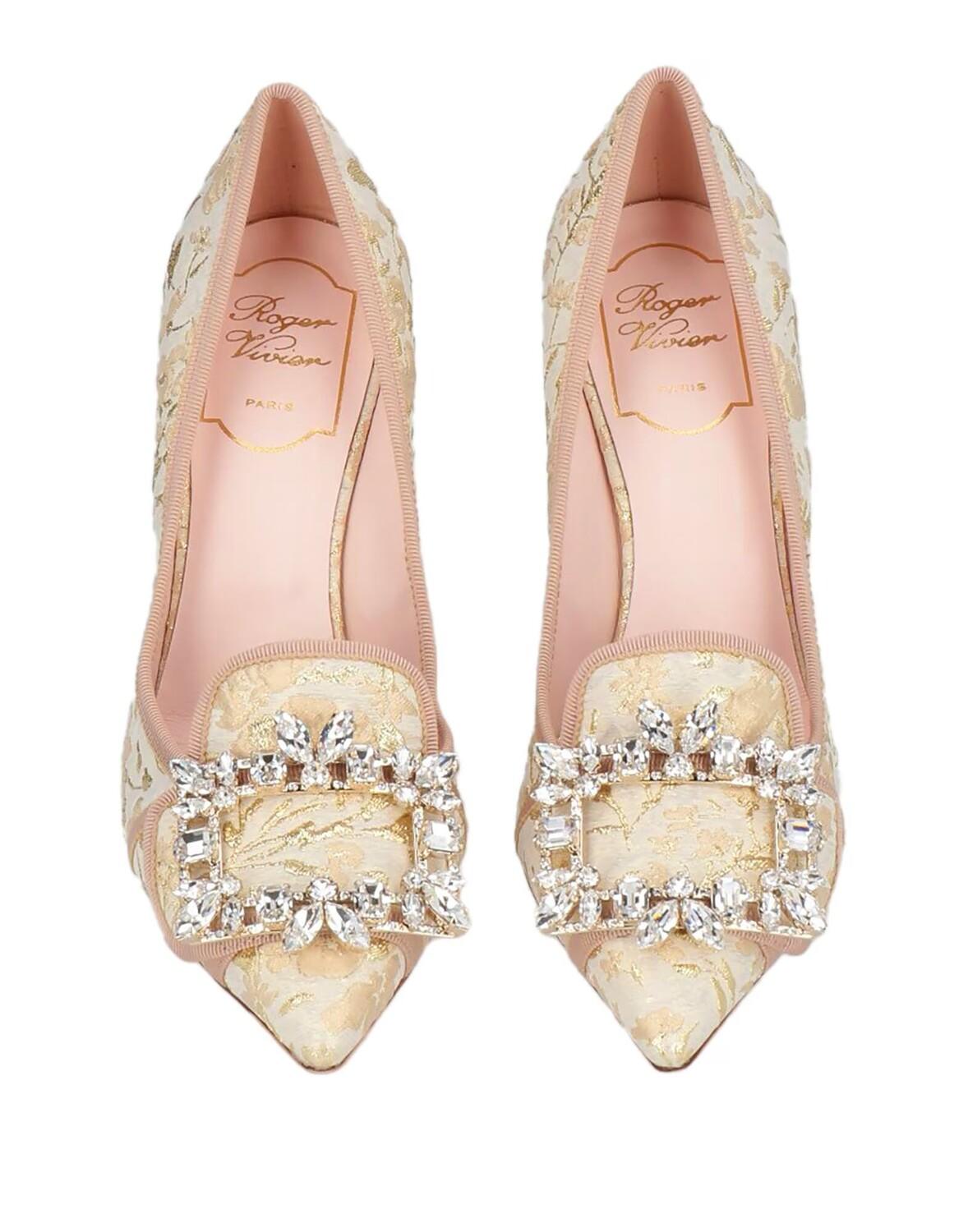 Парча, ламе, стразы, вышивка, цветочный дизайн, кожаная подкладка, узкий носок, тонкий каблук, кожаная/резиновая подошва, содержит нетекстильные части животного происхождения, туфли на шпильке