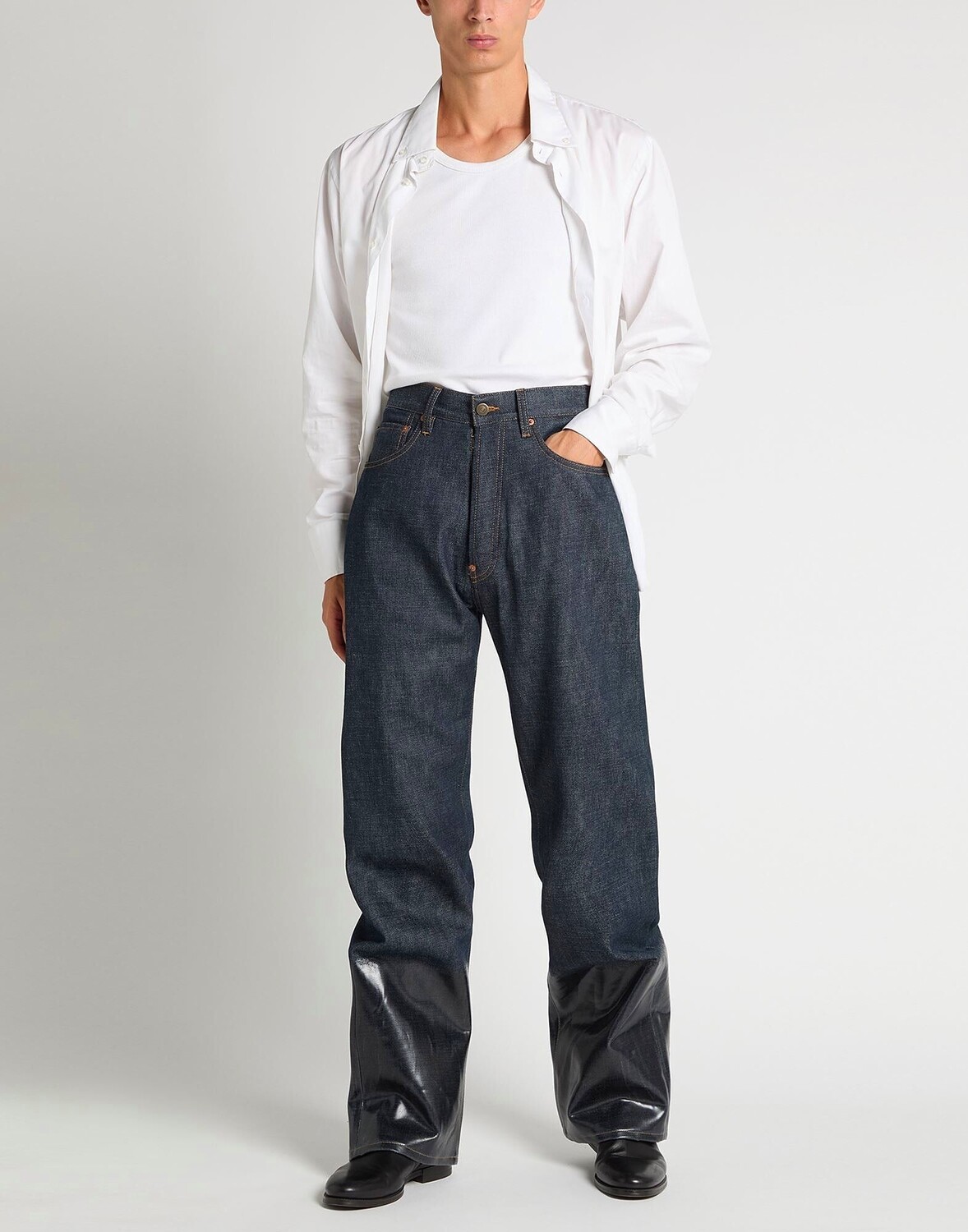 Прямые джинсы, джинсовая ткань, прорезиненная ткань, ремешки, одноцветное изделие, темная стирка, завышенная талия, шлевки для ремня, стандартный крой, застежка на пуговицы, множество карманов, химчистка, нельзя отбеливать, нельзя сушить в стиральной машине