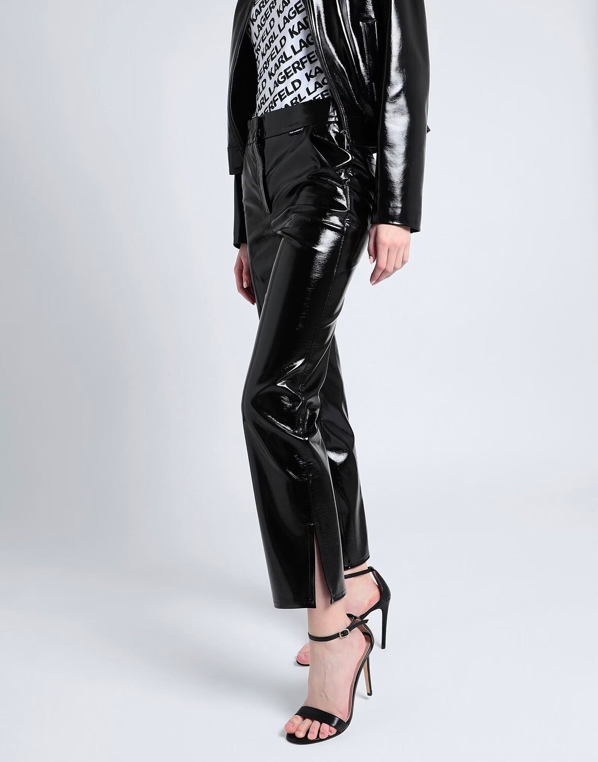 Ткань с покрытием, эффект лака, логотип бренда, одноцветное изделие, завышенная талия, прямые брючины, классический крой, внутренняя часть на частичной подкладке, застежка-молния, застежка на крючки, боковой разрез по низу, множество карманов, брюки