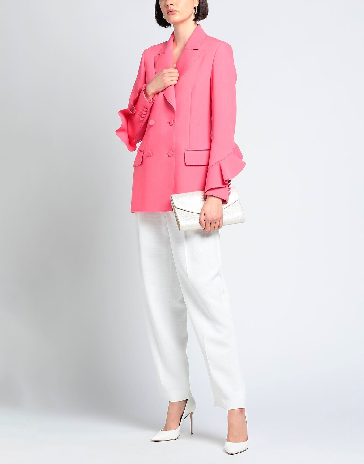 Креп, оборки, одноцветное изделие, воротник с лацканами, двубортный, длинные рукава, внутренняя часть частично на подкладке, застежка на пуговицы, множество карманов, стрейч, специальная чистка или химчистка, нельзя сушить в стиральной машине, не отбеливать, двубортный пиджак