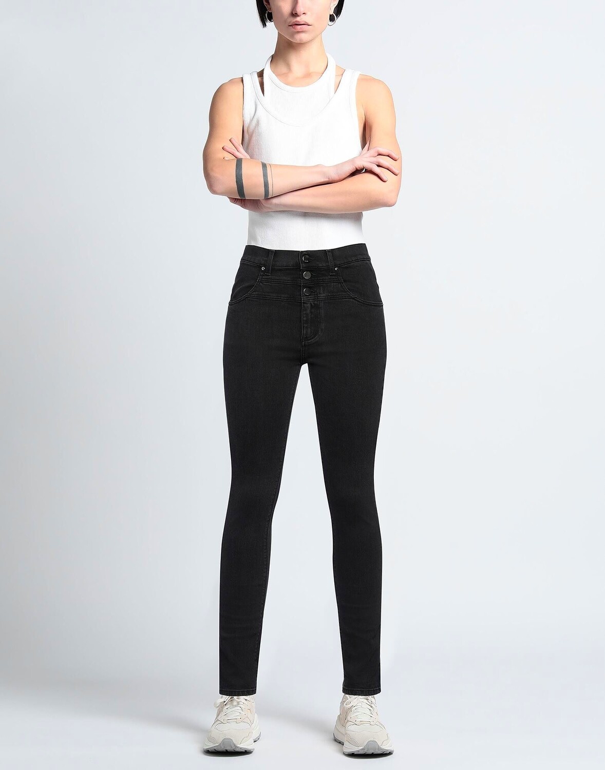 Джинсовая ткань, логотип бренда, одноцветное изделие, цветная расцветка, завышенная талия, зауженные брючины, узкие брюки, застежка на пуговицы, застежка-молния, множество карманов, модель скинни