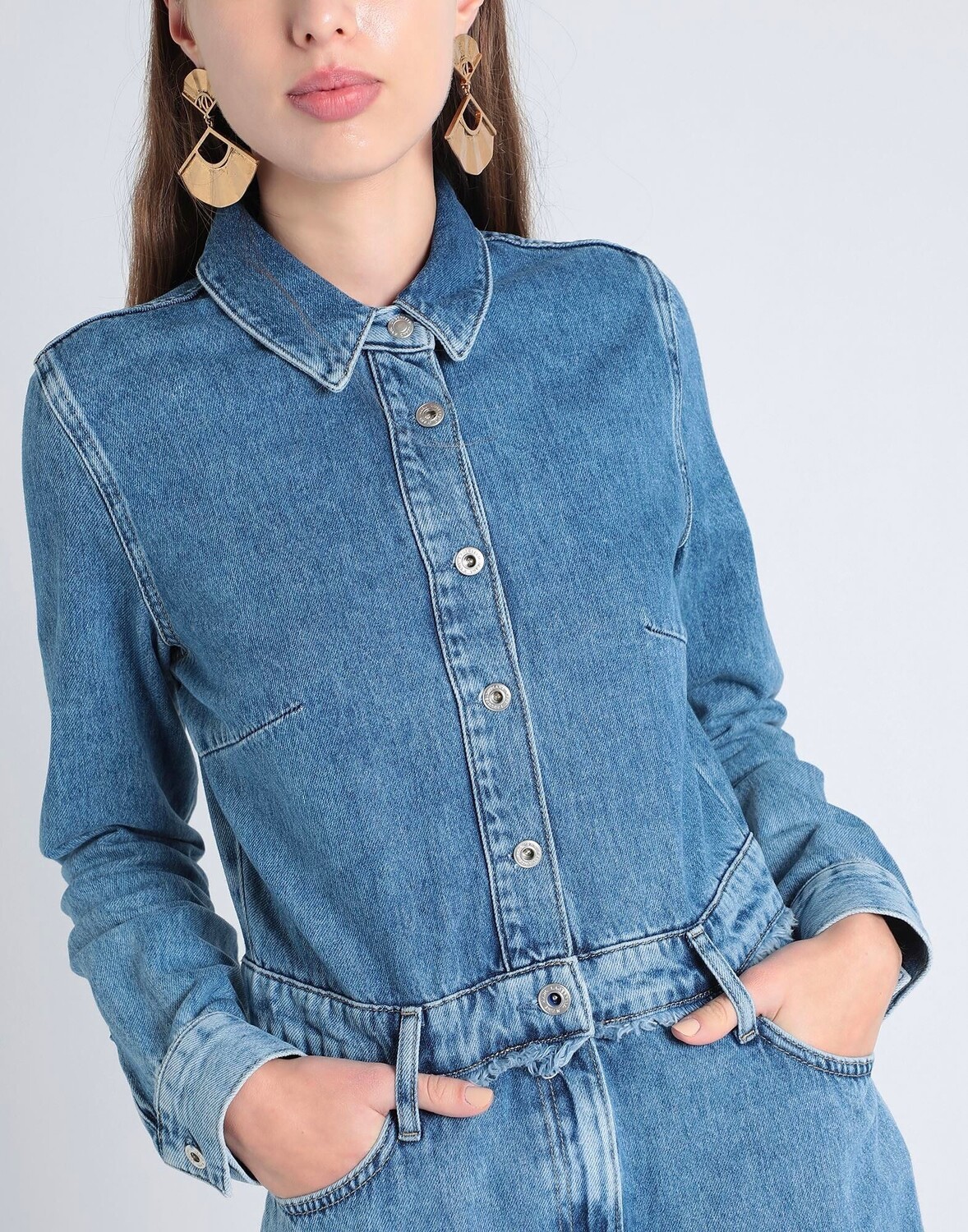 Деним, выцветший, логотип бренда, одноцветное изделие, классический воротник, средняя стирка, длинные рукава, манжеты на пуговицах, без подкладки, застежка на пуговицах, застежка-молния, пять карманов, разрез спереди, содержит нетекстильные части животного происхождения, платье-рубашка