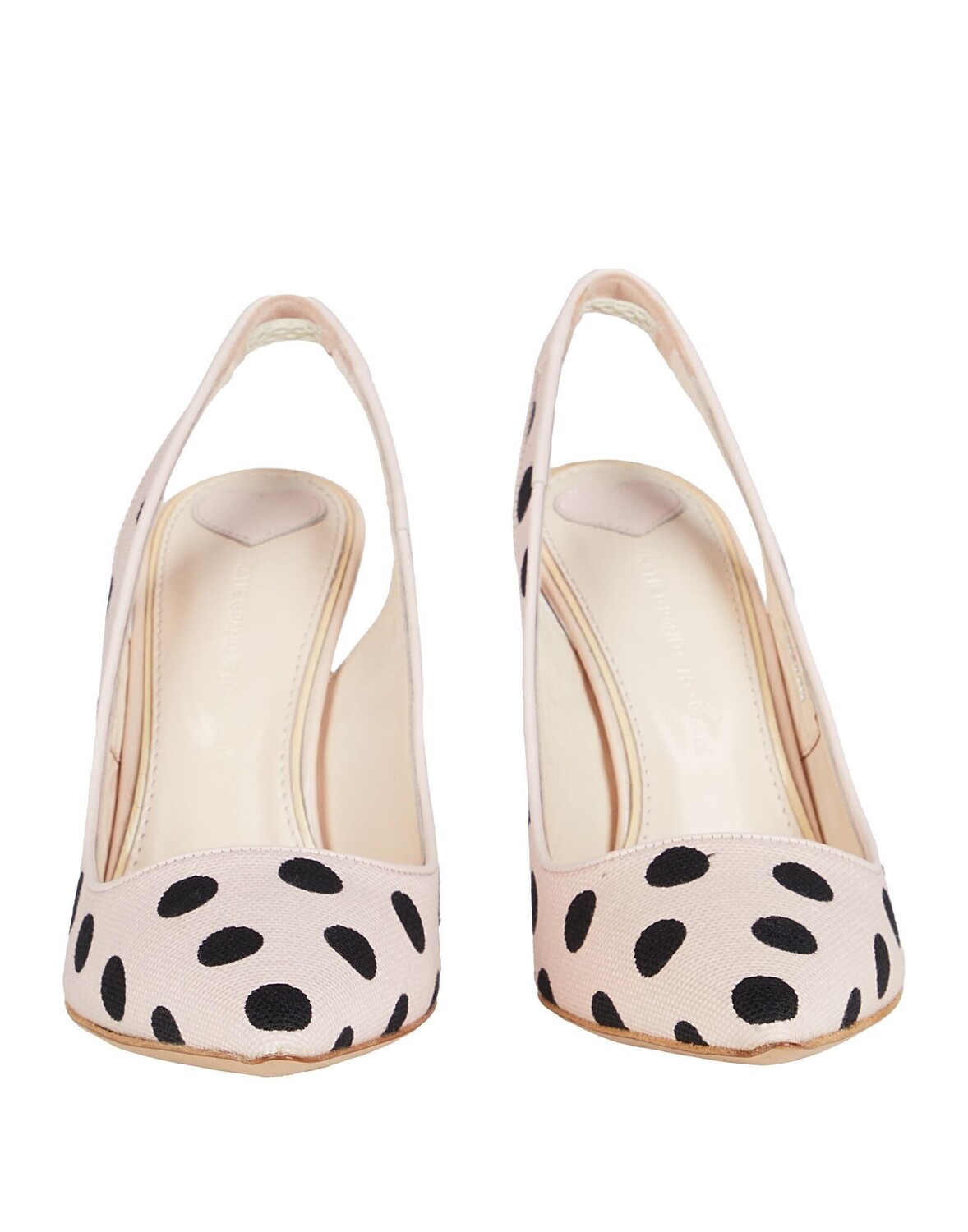 Парусина, кожаная отделка, горошек, кожаная подкладка, острый носок, каблук-шпилька, кожаная подошва, содержит нетекстильные части животного происхождения, туфли-лодочки с пяткой на пятке
