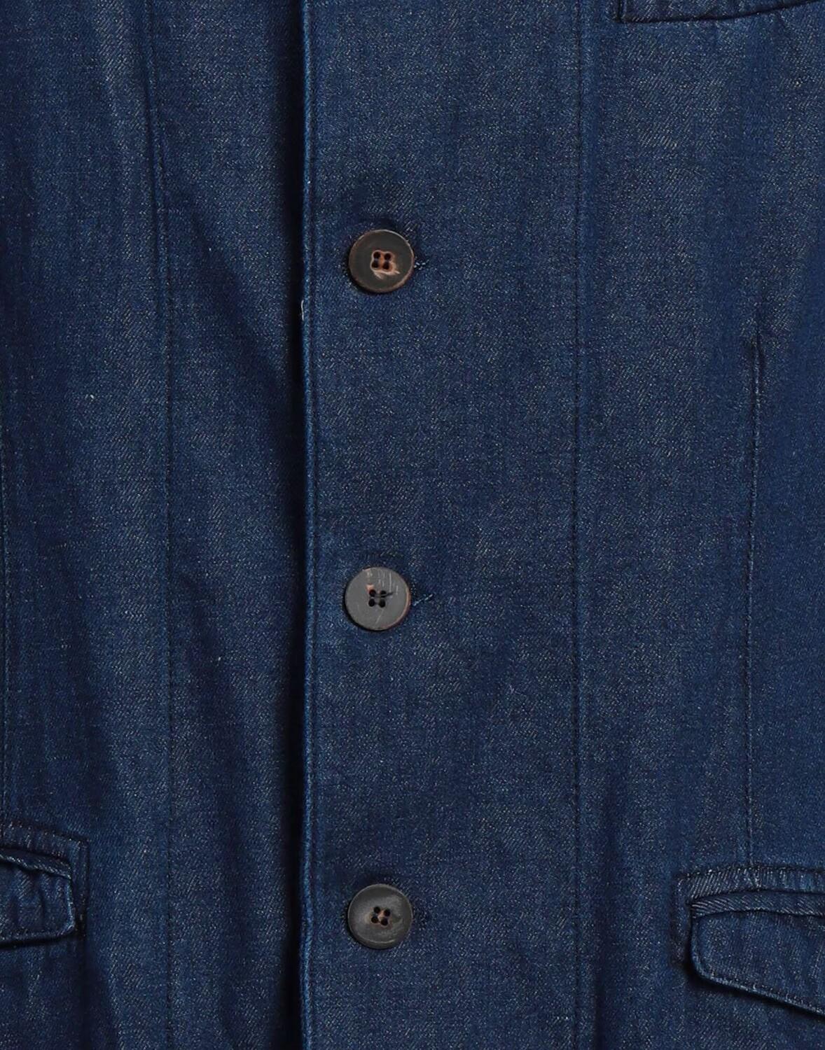 Джинсовая ткань, без аппликаций, одноцветное изделие, темная стирка, классический воротник, однобортный, длинные рукава, манжеты на пуговицах, без подкладки, пуговицы, множество карманов, разрез сзади, однобортный пиджак