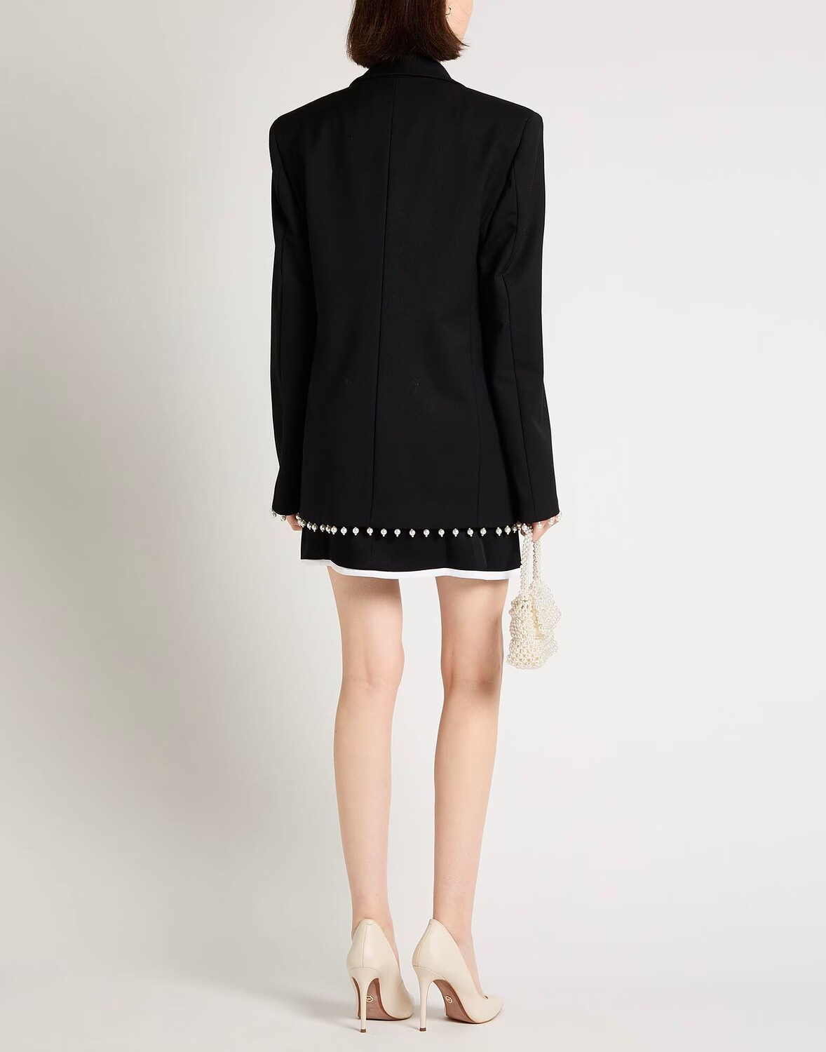 Однобортный пиджак, классная шерсть, бисер, одноцветное изделие с аппликациями, воротник с лацканами, длинные рукава, подплечники, внутри на подкладке, застежка на пуговицы, множество карманов, стрейч, химчистка, нельзя отбеливать, нельзя сушить в стиральной машине
