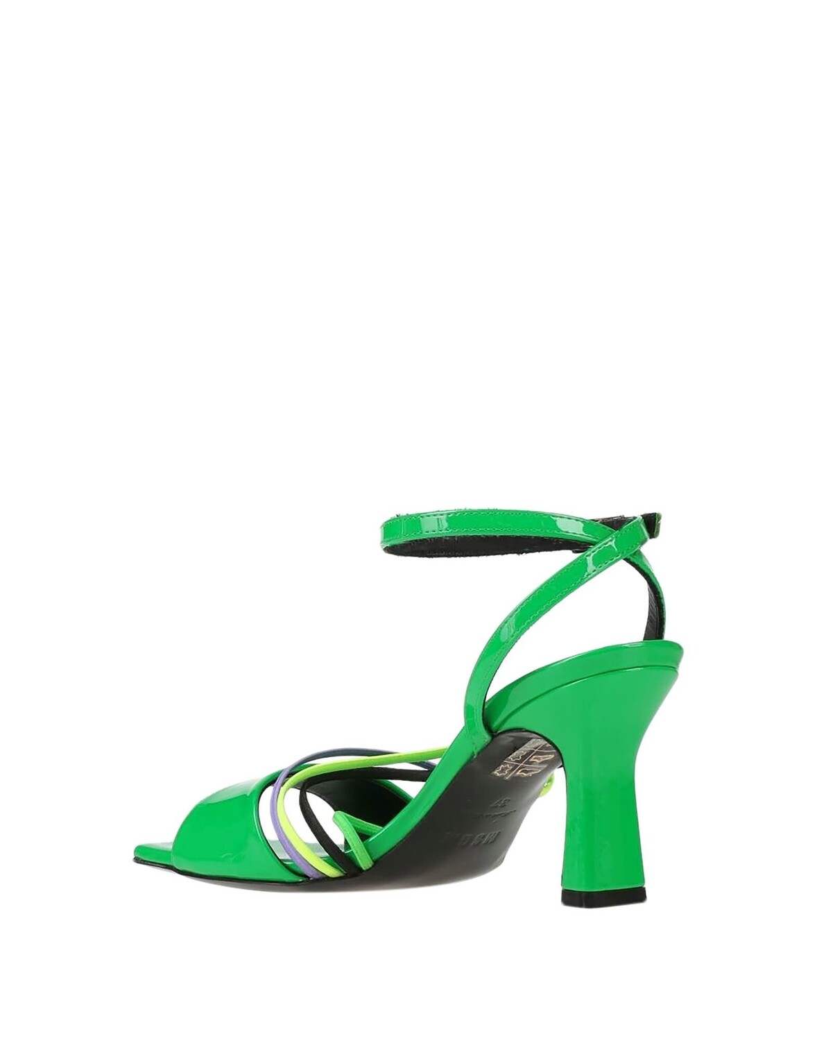 Кожа, эффект лака, контрастные аппликации, разноцветный рисунок, кожаная подкладка, ремешок с пряжкой, квадратный носок, каблук-катушка, кожаная подошва, содержит нетекстильные части животного происхождения, сандалии с ремешком на щиколотке