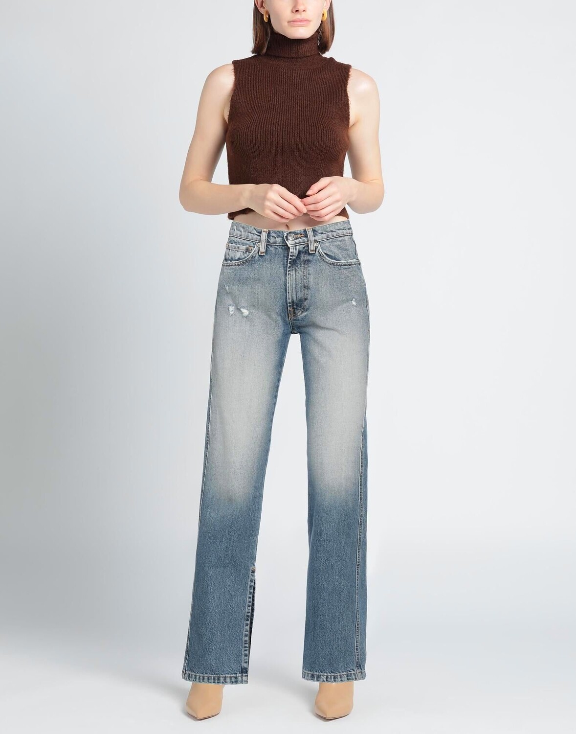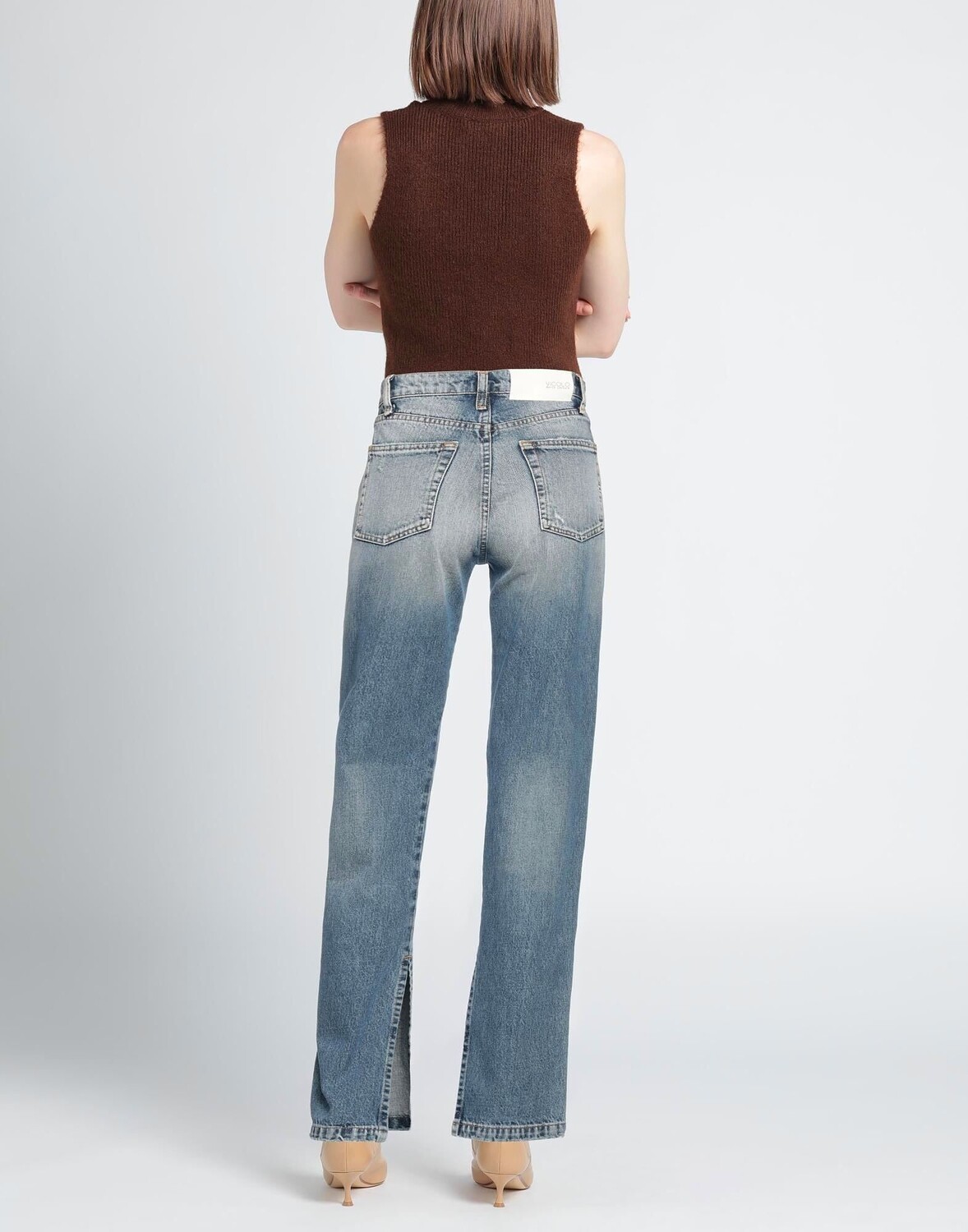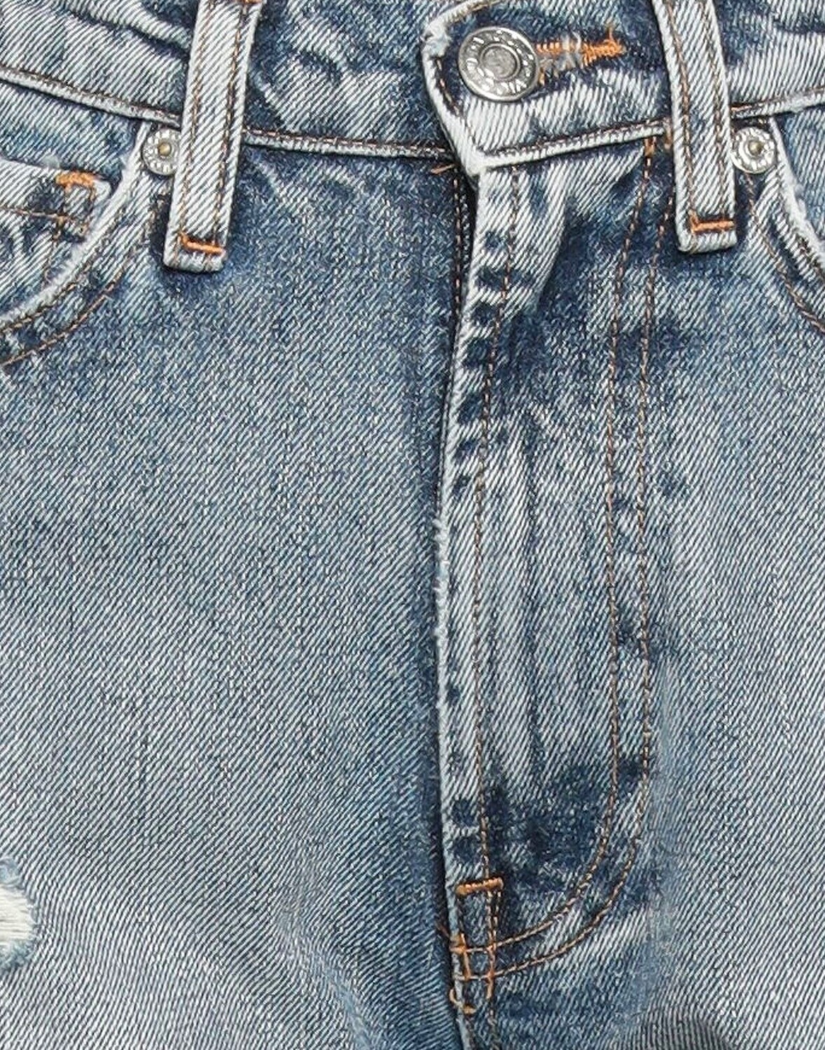 Джинсовая ткань, эффект поношенности, выцветший, металлические аппликации, кожаные аппликации, одноцветное изделие, средняя потертость, средняя посадка, прямые брючины, стандартный крой, застежка-молния, 1 пуговица, боковой разрез по низу, пять карманов, содержит нетекстильные части животного происхождения, модель с прямыми ногами