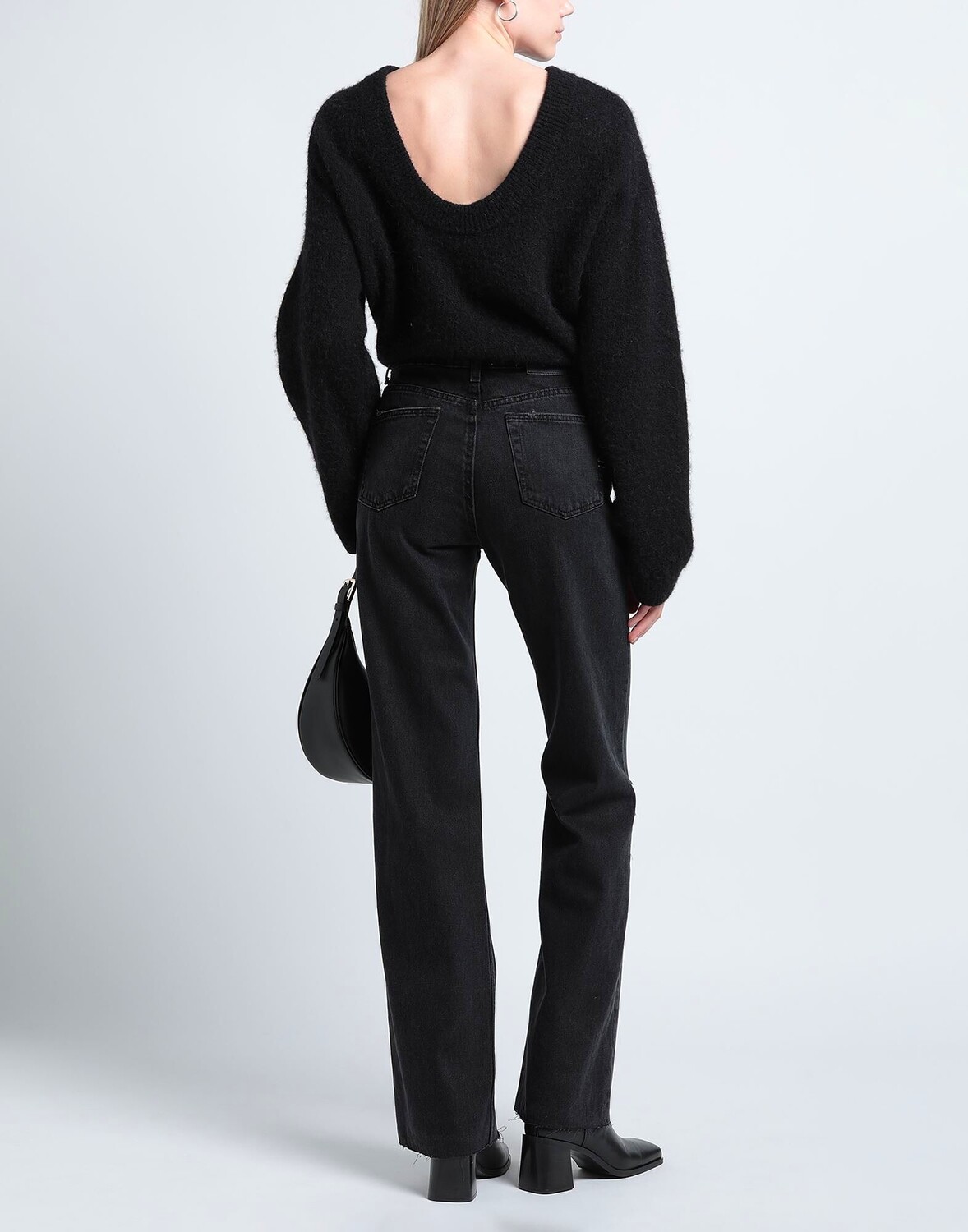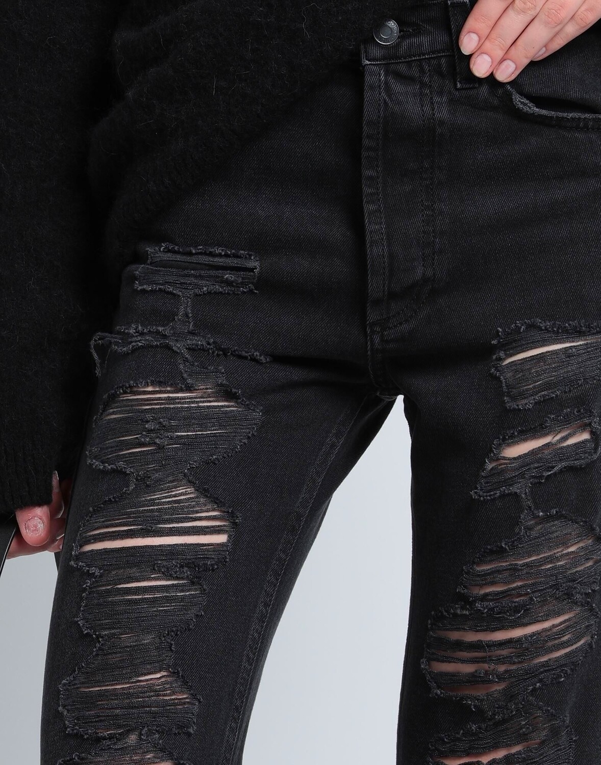 Деним, рваная ткань, кожаные аппликации, одноцветное изделие, цветная стирка, завышенная талия, прямые брючины, стандартный крой, застежка-молния, 1 пуговица, множество карманов, содержит нетекстильные части животного происхождения, модель прямого кроя