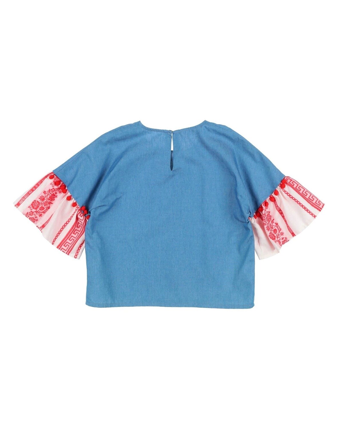 Полотняное переплетение, контрастные аппликации, разноцветный узор, круглый вырез, короткие рукава, 1 пуговица, без карманов, стирка при 30°C, химическая чистка, нельзя отбеливать, нельзя сушить в стиральной машине, гладить при температуре не выше 110°C