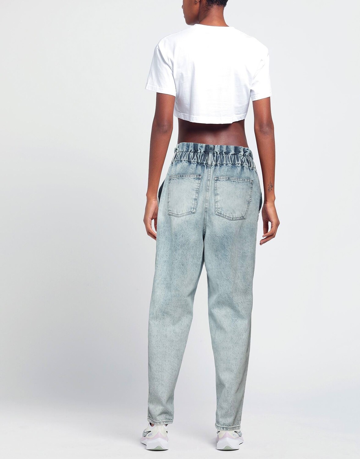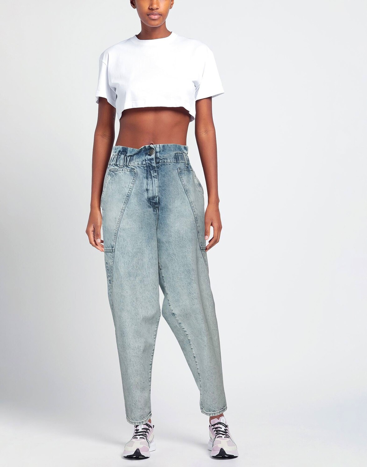 Деним, выцветший, без аппликаций, одноцветное изделие, светлая стирка, завышенная талия, зауженные брючины, классический крой, застежка-молния, 1 пуговица, несколько карманов, зауженная модель
