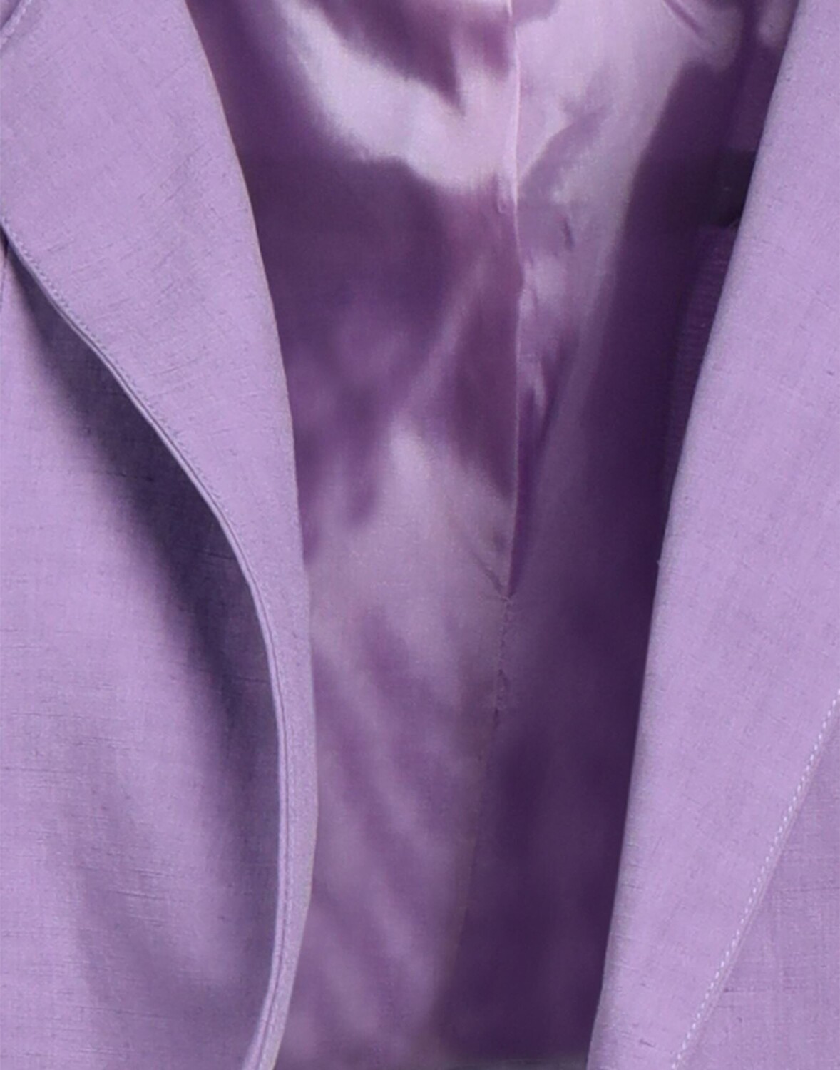 Полотняное переплетение, без аппликаций, однотонное изделие, глубокий вырез горловины, однобортный, рукава 3/4, на подкладке, без карманов, однобортный пиджак