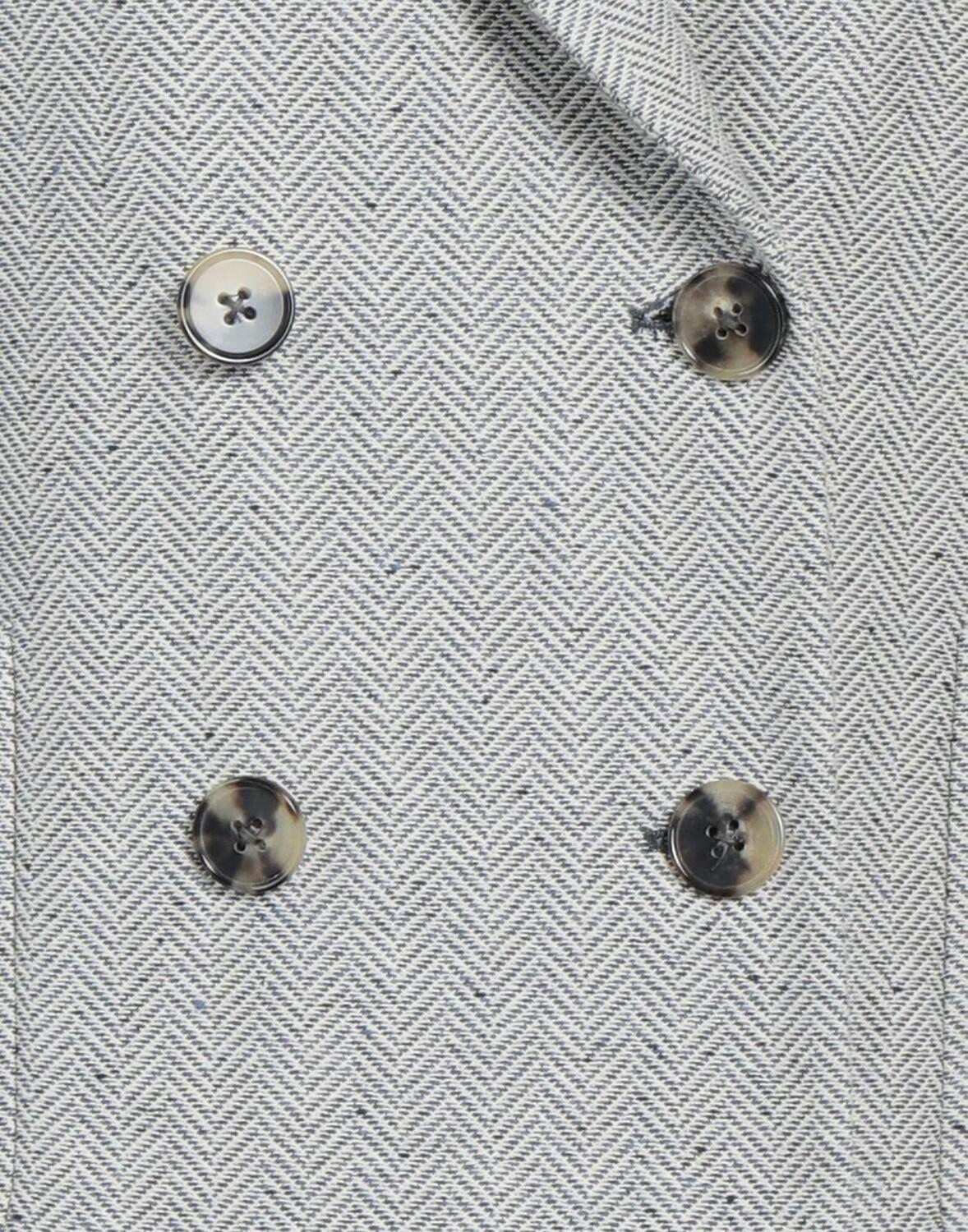 Полотняное переплетение, без аппликаций, узор «елочка», воротник с лацканами, двубортный, длинные рукава, внутренняя часть на частичной подкладке, застежка на пуговицы, множество карманов, разрез сзади, двубортный пиджак