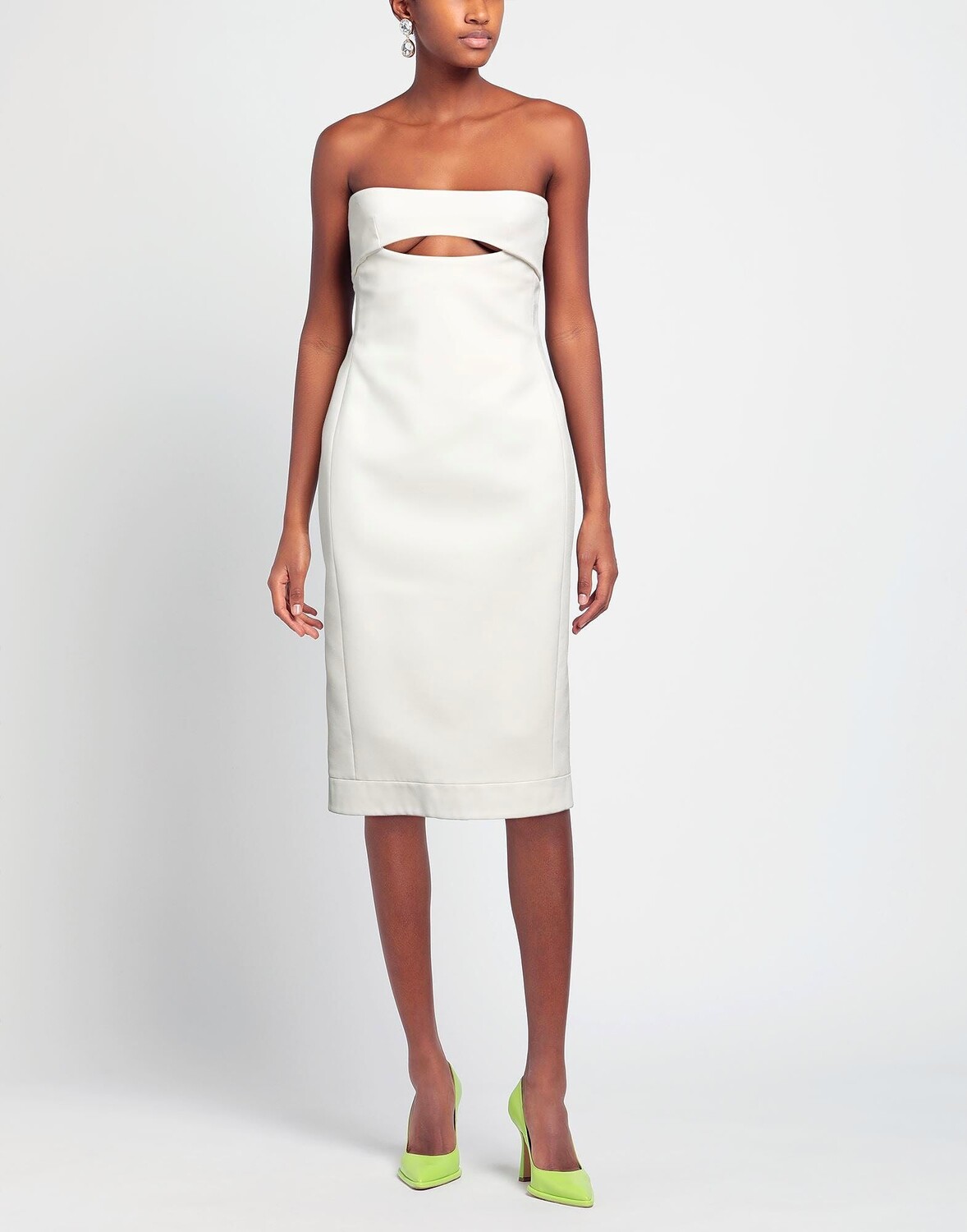 Креп, вырез, одноцветное изделие, без бретелек, без рукавов, внутри на подкладке, застежка-молния, застежки-крючки, без карманов, химчистка, нельзя отбеливать, нельзя сушить в стиральной машине, облегающее платье