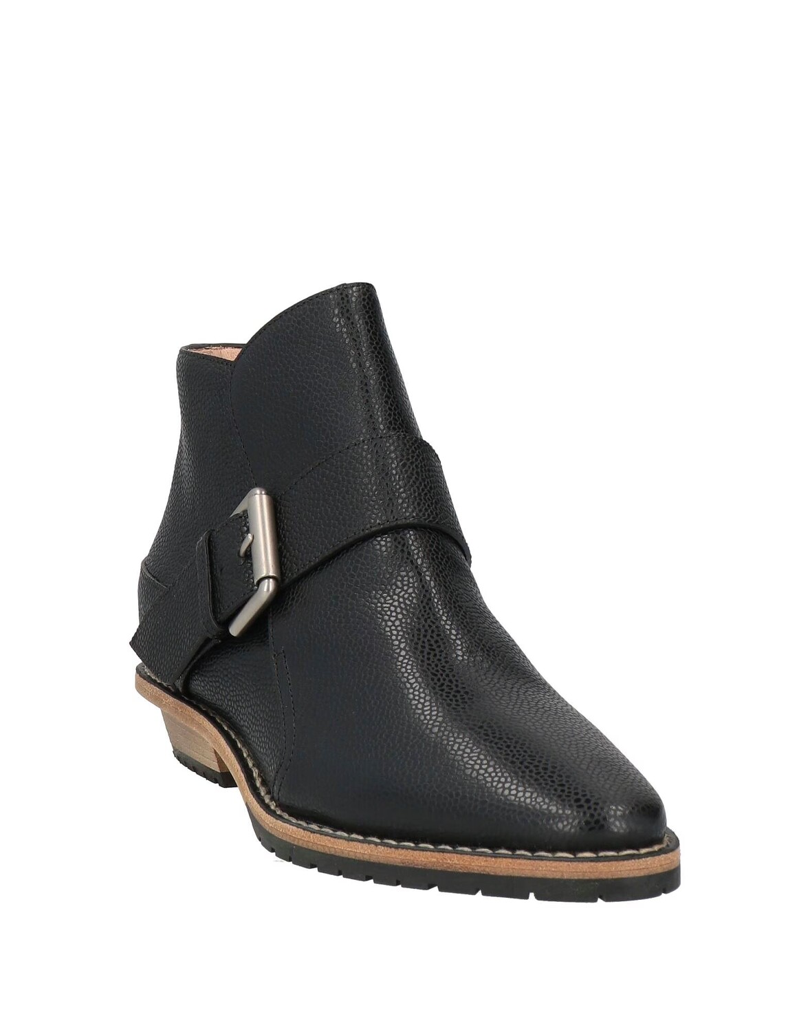 Кожа, текстурированная кожа, пряжка, одноцветное изделие с аппликациями, подкладка из кожи, узкий носок, без каблука, подошва с выступами, содержит нетекстильные части животного происхождения, ботильоны